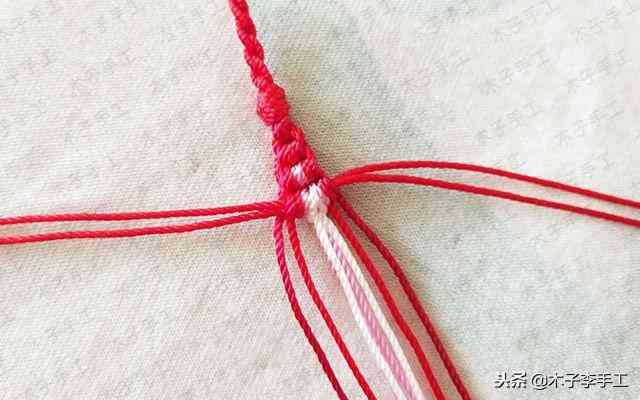 8、所有线拉紧后,轴线继续打圈,再用雀头结挂一根150cm的15股线,这里我加了4根线,想要做宽一点可以用同样的方法继续加线。