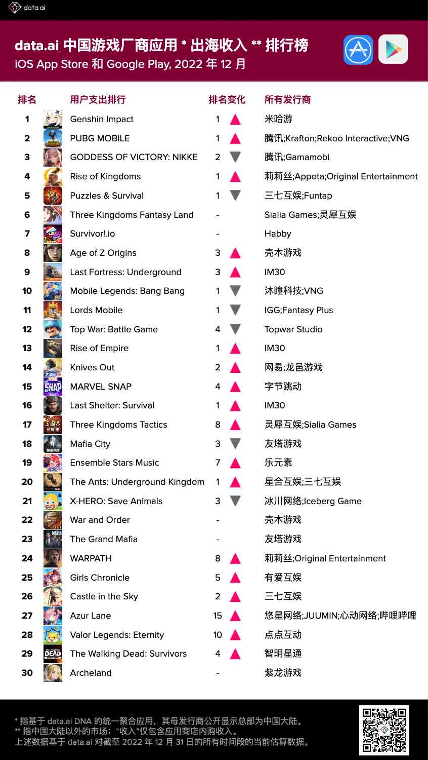 榜单腰部位置,字节跳动上升3位至第13名,旗下《漫威:瞬战超能》(Marvel Snap)本期收入环比增长40%。自2022年11月以来,该游戏已经超越了《炉石传说:魔兽英雄》和《Yu-Gi-Oh! Duel Links 》成为全球收入排名的集换式卡牌游戏。榜单尾部位置,紫龙游戏排名上升14位至第25名,收入增长主要来源于其在韩国市场上线的SRPG游戏《Archeland》,该游戏12月初上线后快速登上韩国手游下载榜第1,收入榜第8。Kunlun Tech排名上升6位进入TOP 30。旗下游戏《The Legend of Neverland》于12月13日在日本推出,上线即登顶日本市场 iOS & Google Play 游戏下载榜。