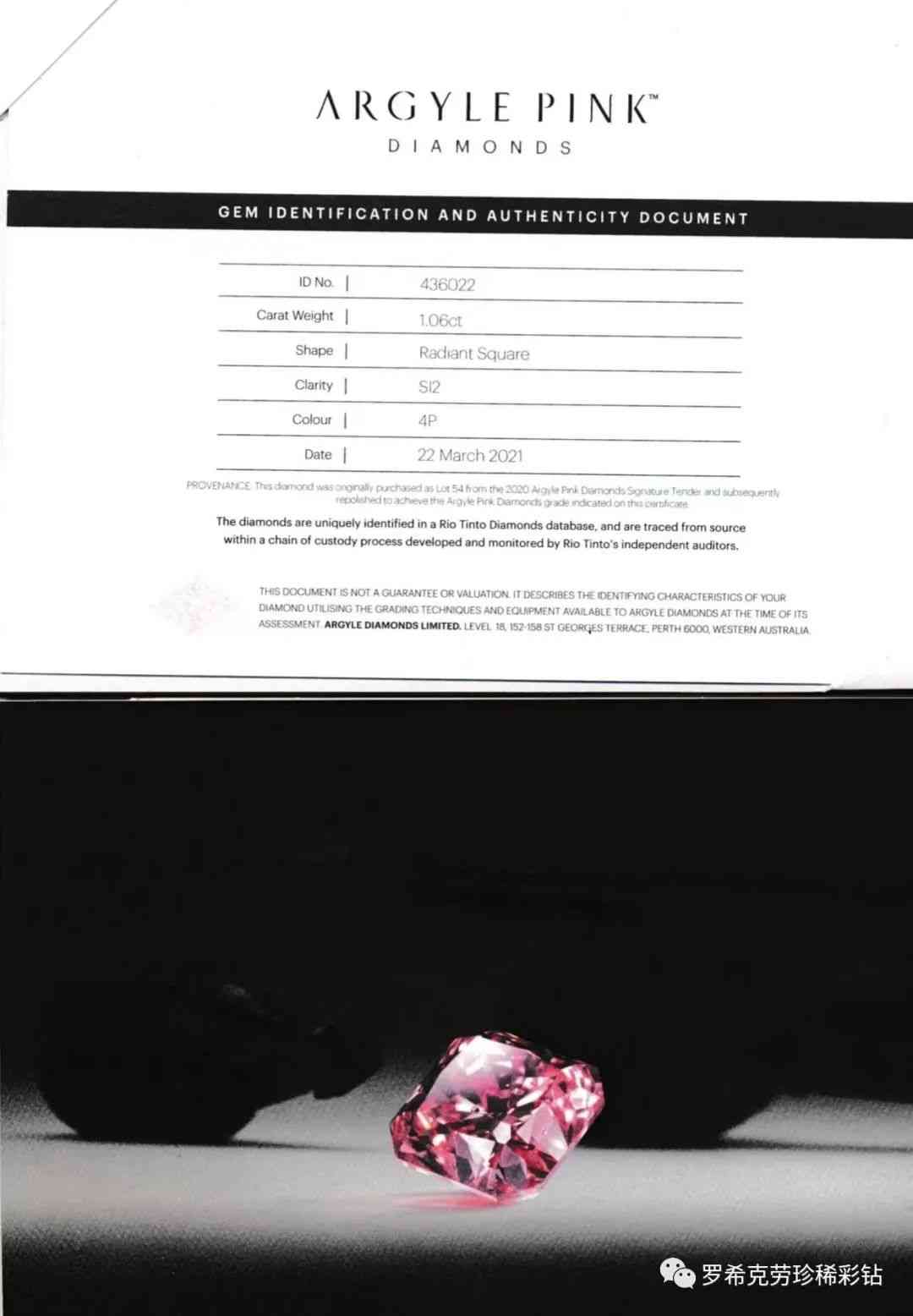 这是一颗1.06克拉的阿盖尔粉钻,阿盖尔颜色评级标准为等级4P、净度为SI2。