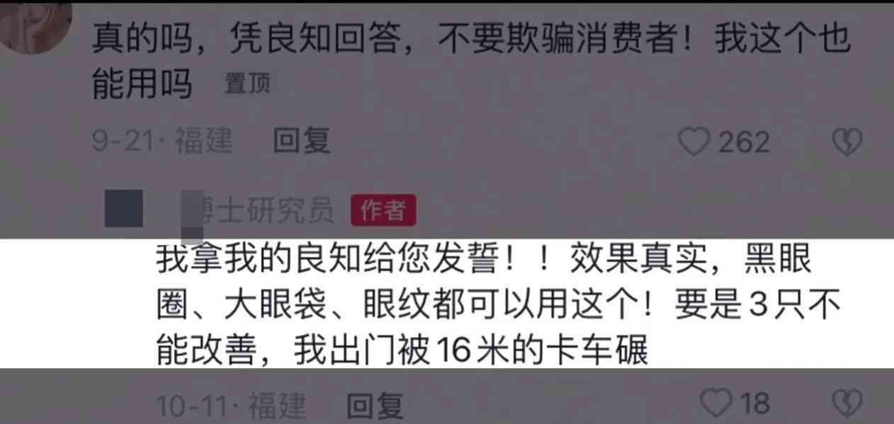 品牌方以各种视听手段暗示他们的产品可以解决眼袋、泪痕等各种眼周问题,并在评论区对提出质疑的网友赌咒发誓: