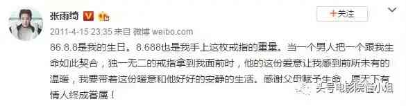 当时,张雨绮还公开表示:“86.8.8是我的生日,8.688也是我手上这枚戒指的重量。当一个男人把一个跟我生命如此契合,独一无二的戒指拿到我面前时,他的这份爱意让我感到前所未有的温暖,我要带着这份暖意和他好好的安静地生活。”
