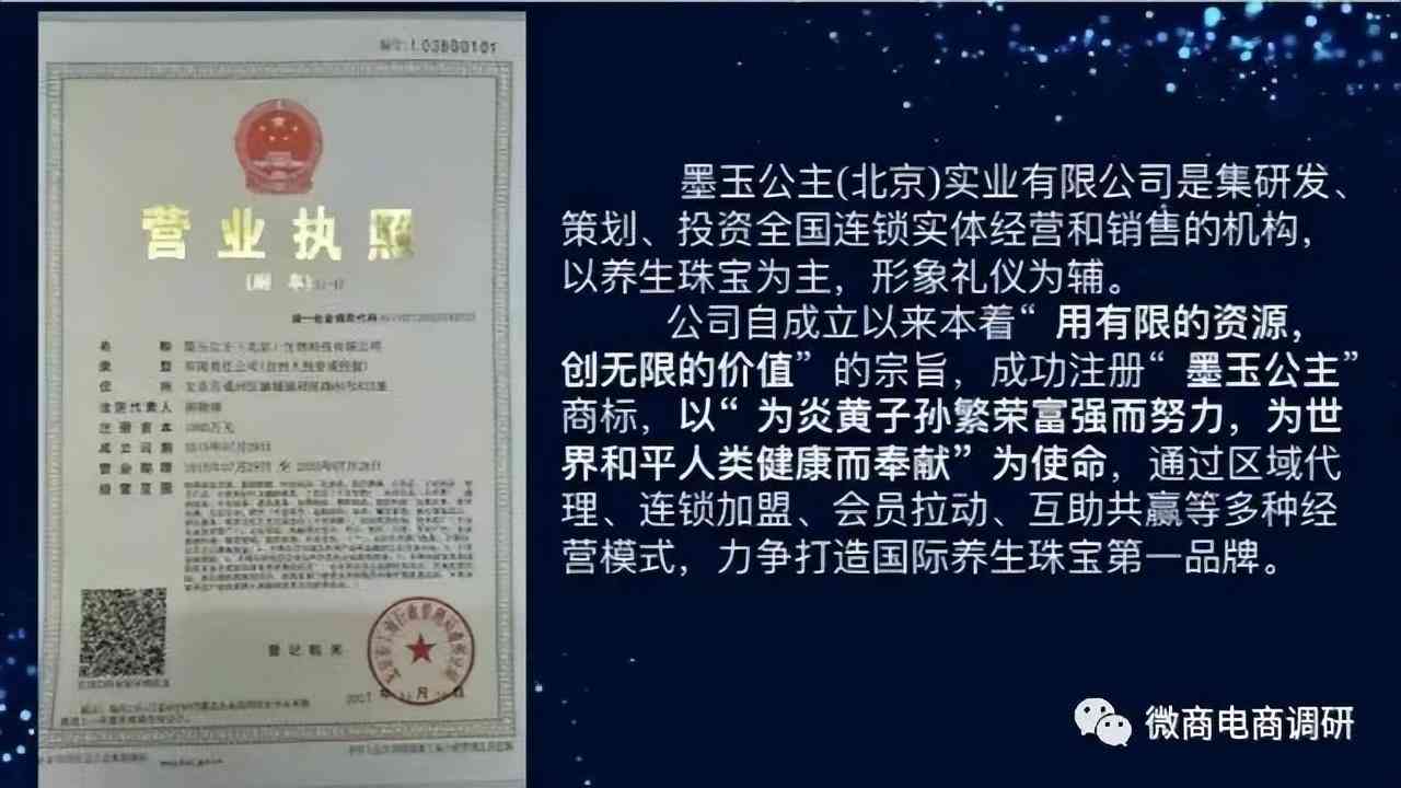 据宣传资料,墨玉公主(北京)生物技术有限公司是一家集研发、生产、销售、投资全国品牌连锁实体店的机构,在北京、苏州、商丘等地成立连锁机构品牌及高端珠宝商务会所。以养生珠宝为根本,国学易理文化为推动,布局大健康产业、电商平台、品牌餐饮连锁、文化旅游小镇等。