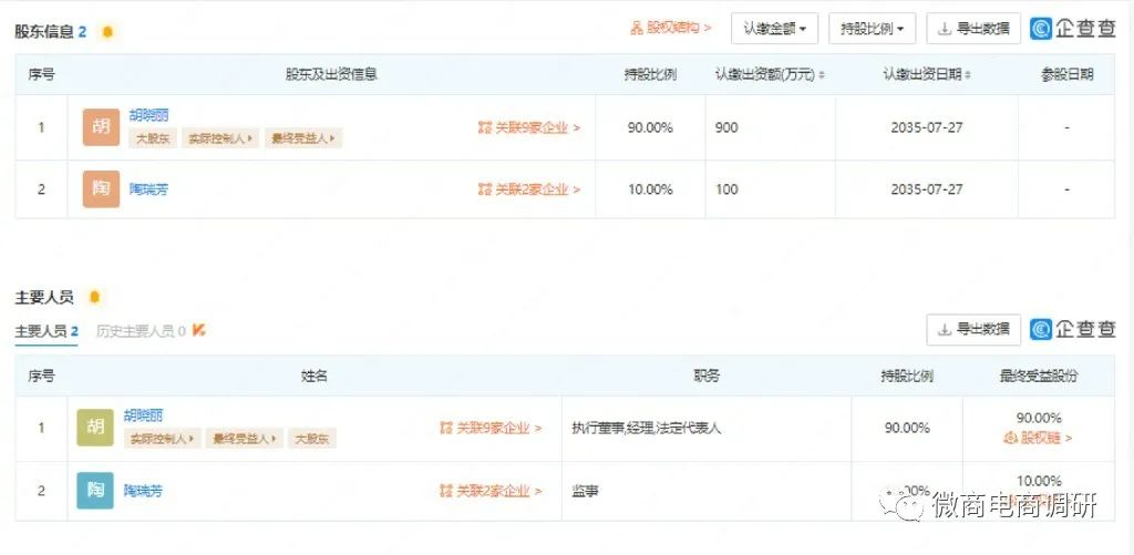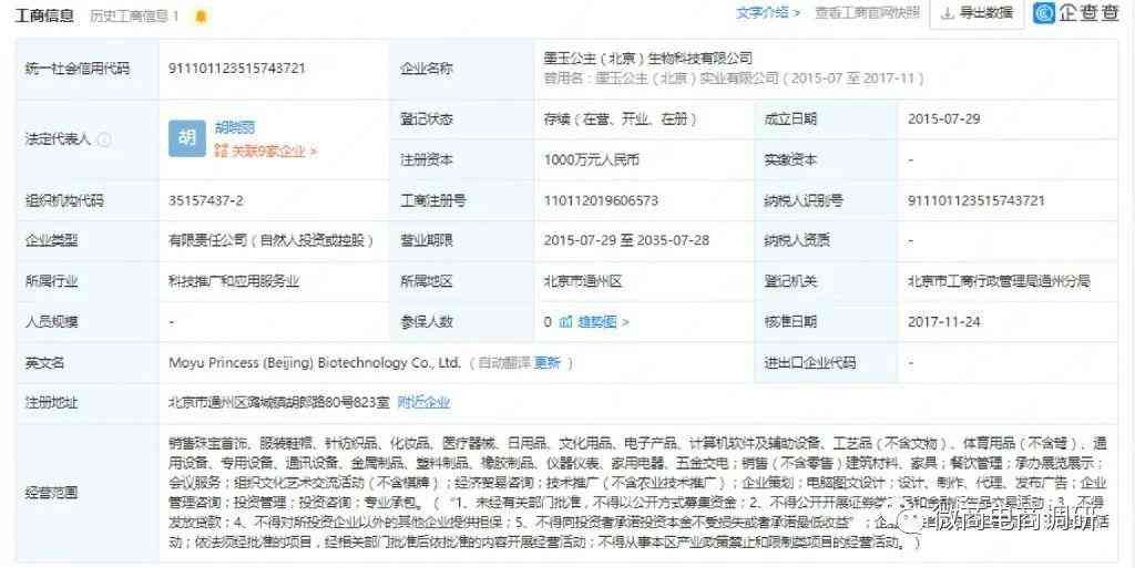 企查查APP显示,墨玉公主(北京)生物科技有限公司成立于2015年7月29日,注册地位于北京市通州区潞城镇胡郎路80号823室,注册资本为1000万元,实缴资本为0,法定代表人为胡晓丽。该公司由胡晓丽控股90%并担任执行董事兼总经理,陶瑞芳持股10%并担任监事。胡晓丽是该公司的实际控制人和最终受益人,同时也是墨玉公主的创始人。