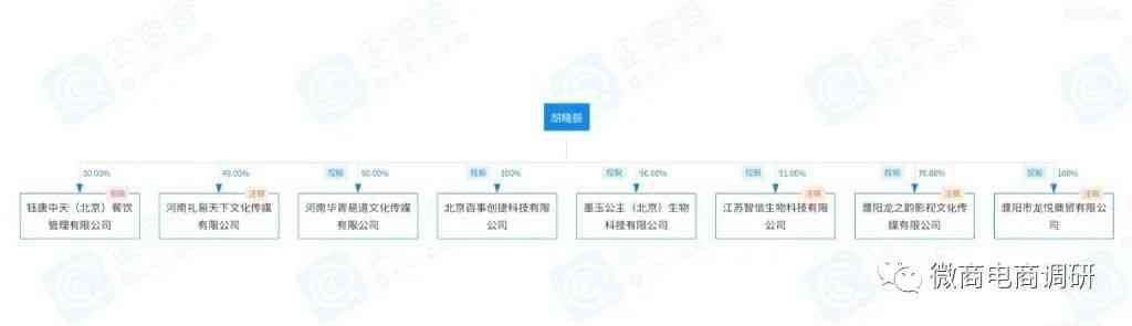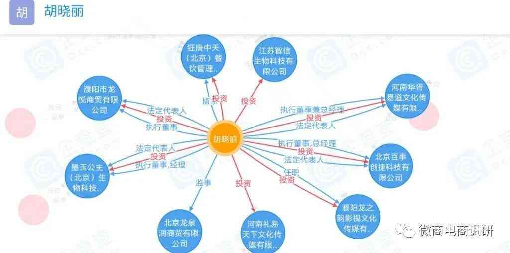 根据企查查可知,胡晓丽共和9家企业有关联,她不仅是墨玉公主(北京)生物科技有限公司的董事长,还对外投资了河南华胥易道文化传媒有限公司,控股90%并担任法定代表人、执行董事兼总经理;投资了北京百事创捷科技有限公司,控股100%并担任法定代表人、执行董事兼总经理;投资了河南礼易天下文化传媒有限公司,持股49%;投资了江苏智信生物科技有限公司,控股51%;投资了濮阳市龙悦商贸有限公司,控股100%并担任法定代表人和执行董事;投资了濮阳龙之韵影视文化传媒有限公司,控股70%;投资了钰唐中天(北京)餐饮管理有限公司,持股50%并担任监事;还在北京龙泉润商贸有限公司任职监事。