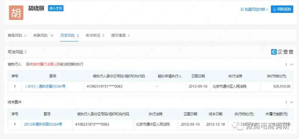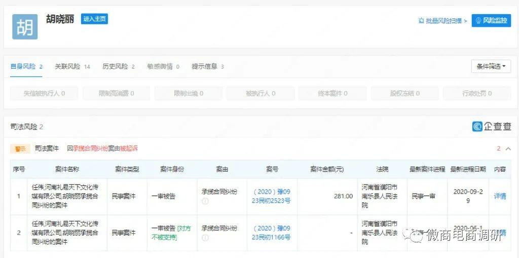 但值得注意的是,河南礼易天下文化传媒有限公司、江苏智信生物科技有限公司、濮阳市龙悦商贸有限公司和濮阳龙之韵影视文化传媒有限公司都已是注销状态,钰唐中天(北京)餐饮管理有限公司和北京龙泉润商贸有限公司也都已被吊销。胡晓丽本人涉及一起终本案件,还因承揽合同纠纷案由被起诉2次,因未按时履行法律义务被法院强制执行1次。