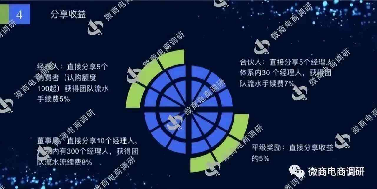 推荐好友可以获得其认购金额5%的推荐奖励,直接推荐5个有效用户(最少认购100)可以升级为经理,经理可以获得自己团队流水手续费5%的团队奖励,直接推荐的好友达到经理人同级可获得其收益5%的平级奖励;直接推荐5个经理人且团队内拥有30个经理人可升级为合伙人,合伙人可以获得团队流水手续费7%的团队奖励,还可以获得团队中经理人2%的极差奖励,若直接推荐的好友有人达到合伙人同级,可以获得其收益5%的平级奖励;直接推荐10个经理人且团队内拥有300个经理人可升级为董事局,董事局可以获得团队流水手续费9%的团队奖励,还可以获得团队中经理人和合伙人2%~4%的极差奖励,若直接推荐的好友有人达到董事局同级,可以获得其收益5%的平级奖励。