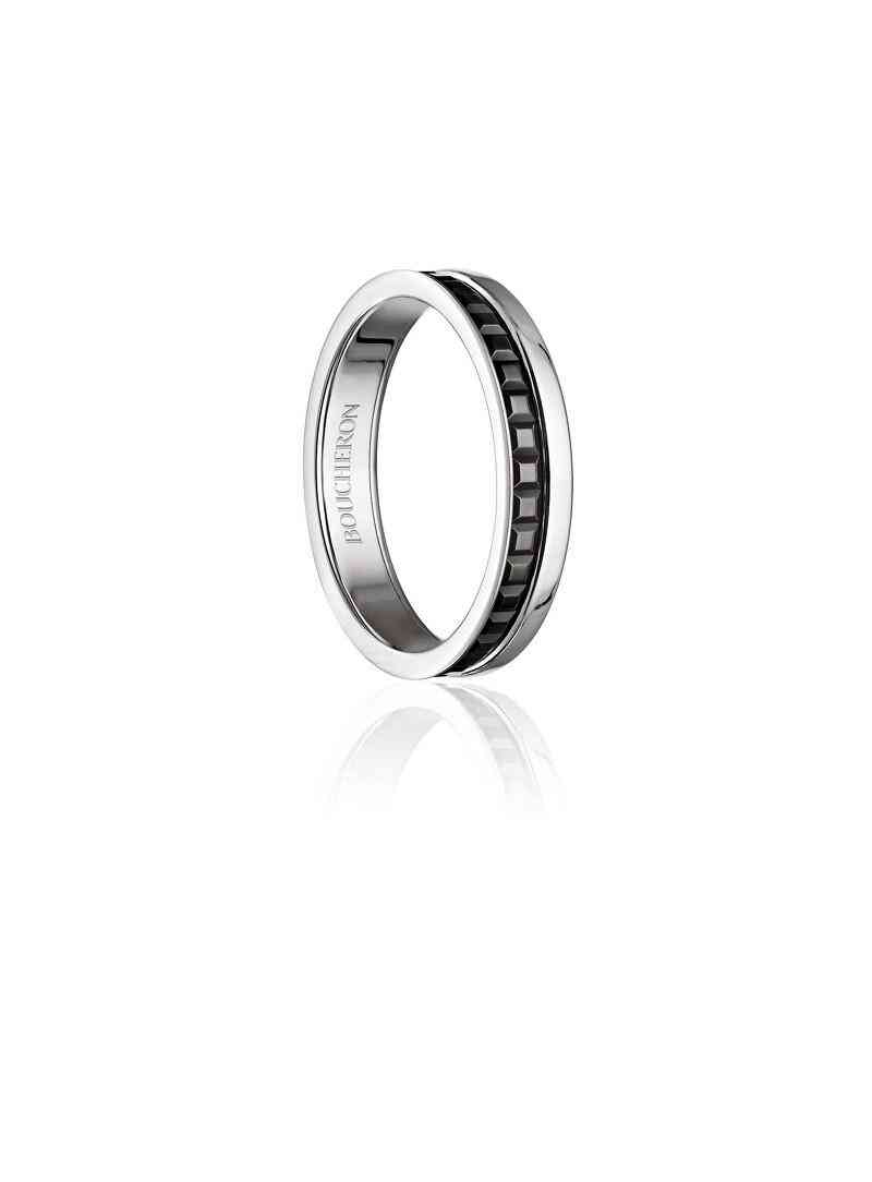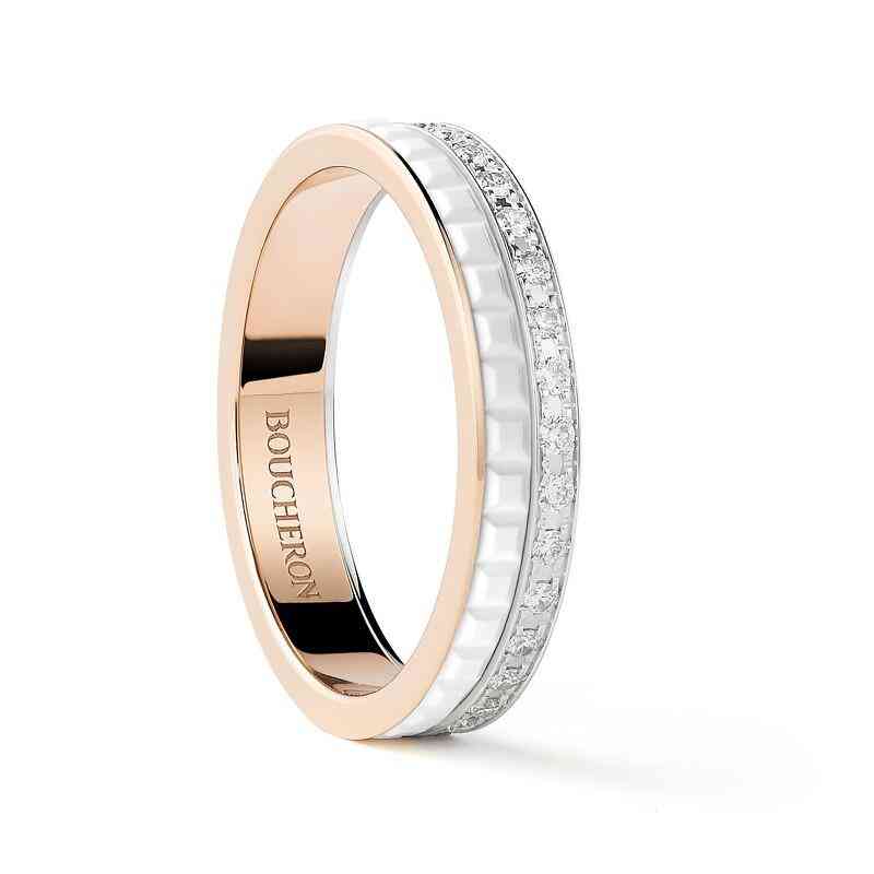 辨识性一流的 Boucheron Quatre 系列从经典建筑元素得到启发,借着金工珠宝技法揉合罗缎直线刻纹(Grosgrain)、钻石圈(line of Diamonds)、双圈同心圆(Double Godron)和巴黎饰纹(Clou de Paris),变化出单一、二、四、K金、镶钻、陶瓷等……多种纹理质感、光线与色彩材质的设计,让人怎样混搭、叠戴都出色。