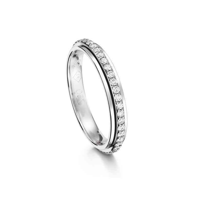 De Beers Infinity 系列戒指以无尽符号为主轴,可说是以设计示爱的完美模范代表款式,交叠环绕的戒圈线条也从稍宽渐窄,搭配两股之一以密钉镶圆形明亮式钻石点缀,更显曲线的精致,难怪连年有着出色销售表现。