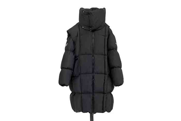 该系列提供全黑外套单品,包括三个核心款式:带衬垫围巾细节的尼龙纹理派克大衣、高光泽尼龙人造皮革马甲和采用对比色人造皮革袖子制成的短款夹克。