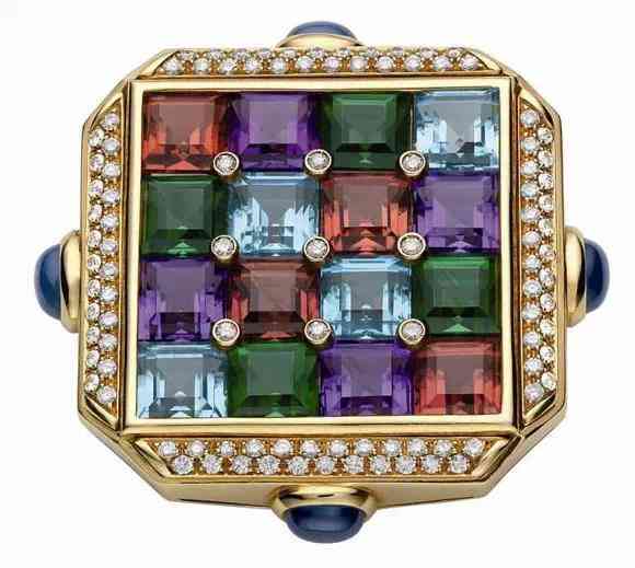黄金胸针,镶嵌海蓝宝石,紫水晶,绿色及绿色碧玺,蓝宝石与钻石