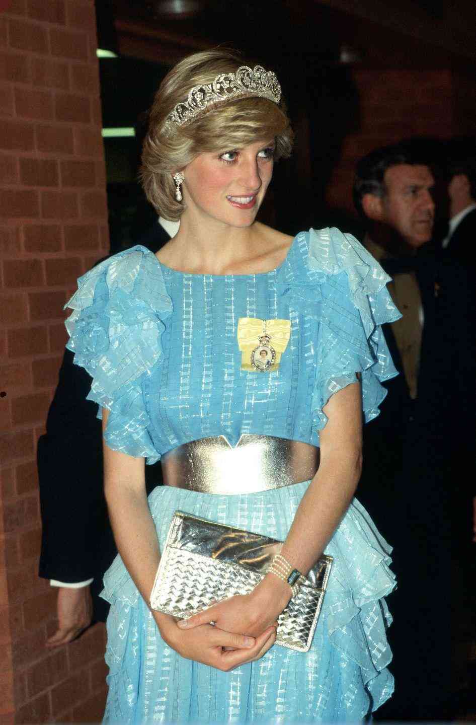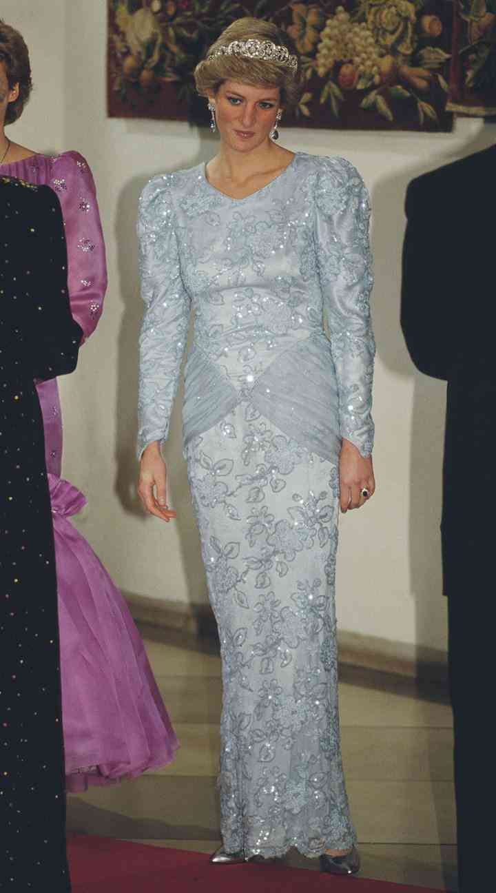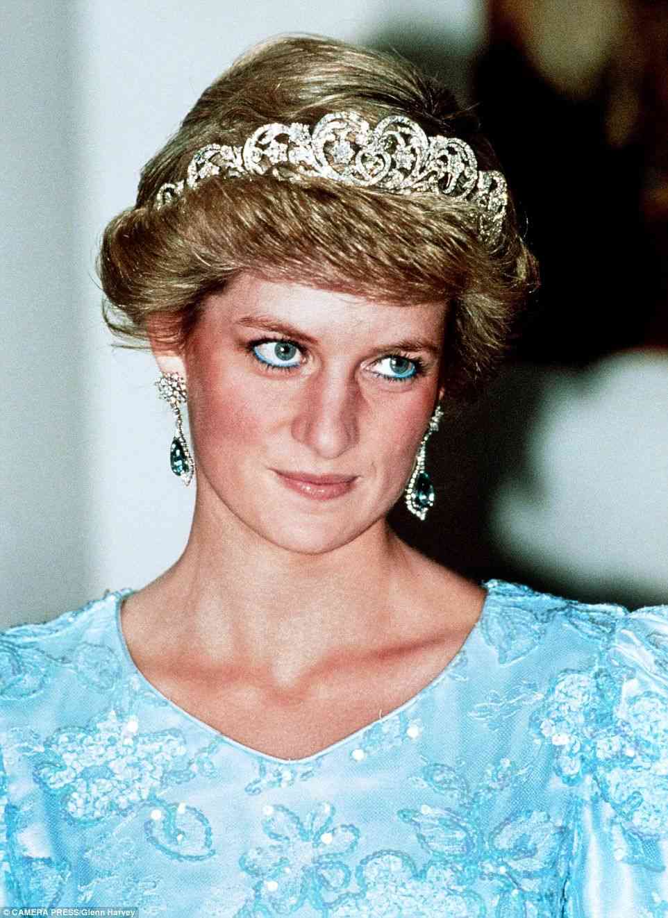 除了在如电影节这样带有一些娱乐意味的文化场合中佩戴,她还在国事招待会中,用斯宾塞家族王冠来与之搭配,比蓝宝石更能衬托出戴安娜王妃湖水一般湛蓝的眼睛。