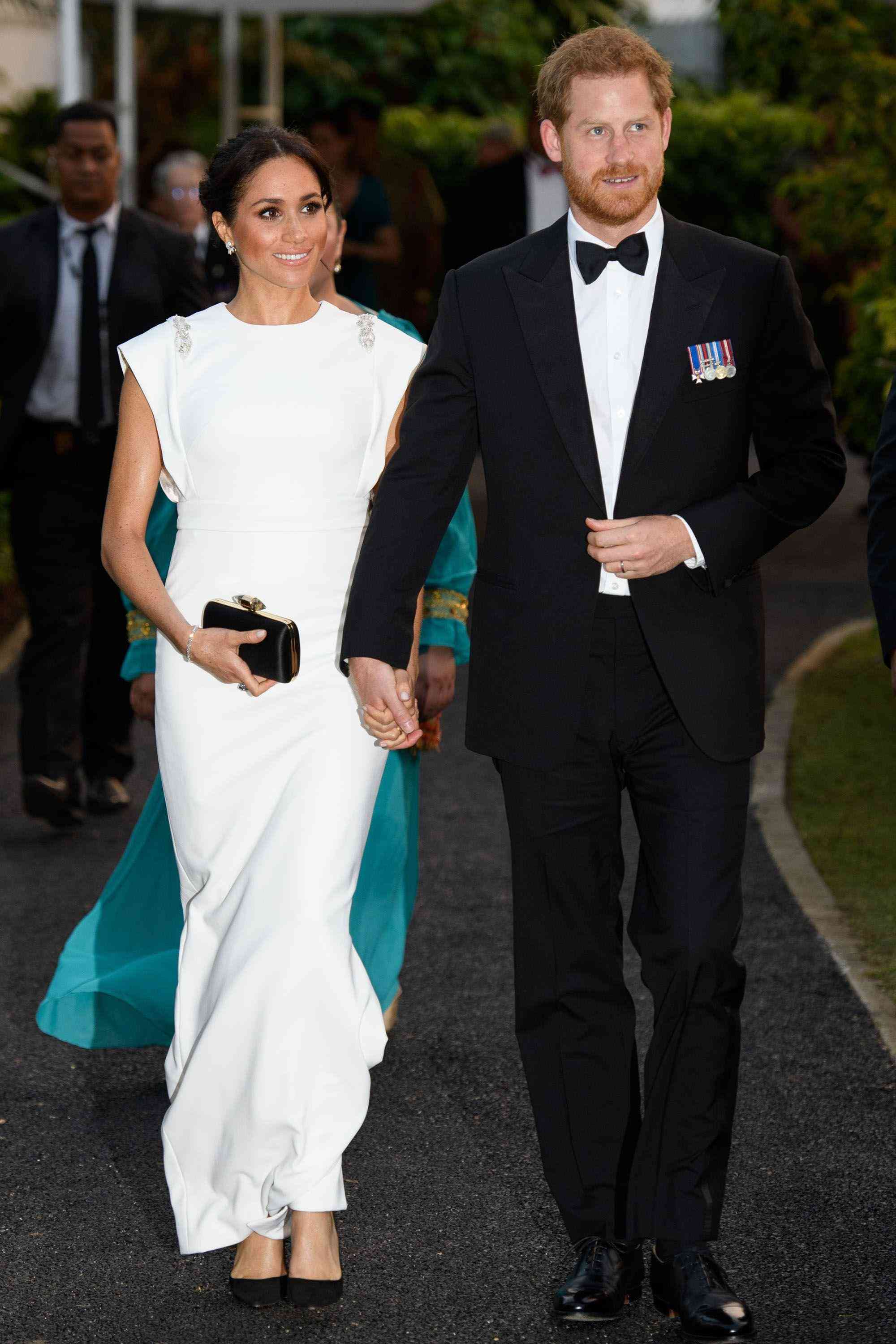 2018年在访问汤加王国时,梅根再次佩戴了她,搭配的依旧是戴安娜王妃的钻石手链。
