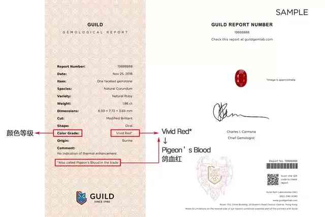 ·在GUILD颜色分级和产地证书中,鸽血红(Pigeon’s Blood)以【Vivid Red*】表示,并在左下角注释:*Also called Pigeon’s Blood in the trade,译为:*在宝石商贸中也称为鸽血红(图3)。