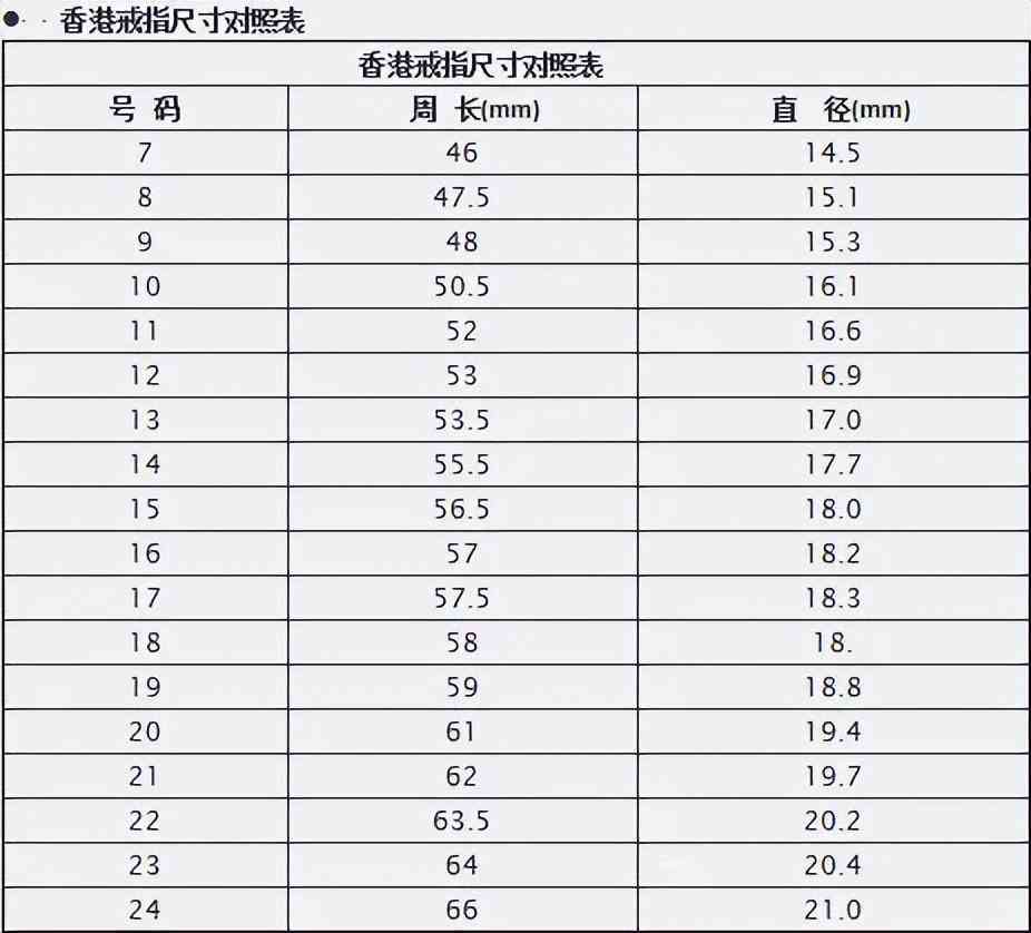 2、香港戒指圈口尺寸对照表