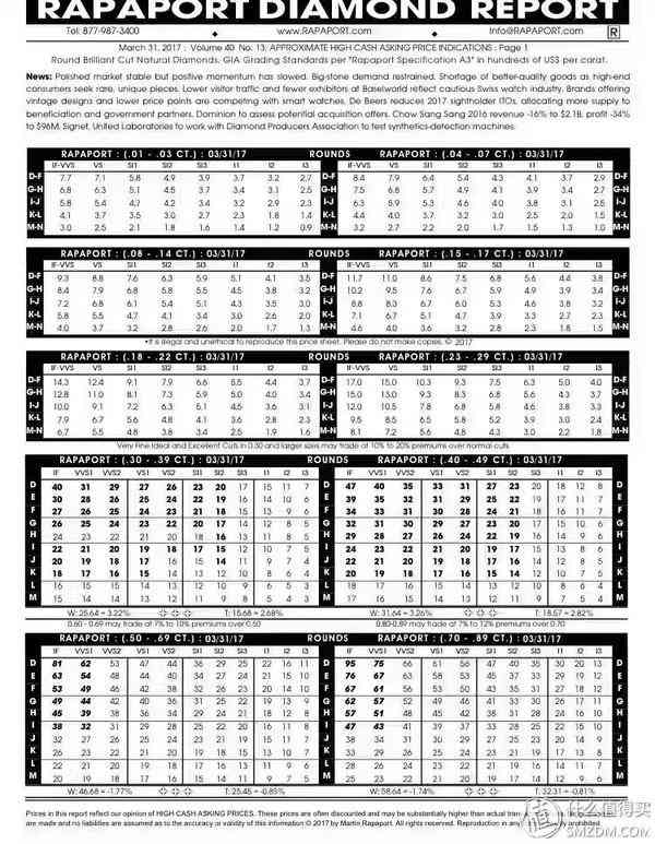 前面有提到RAP,RAP就是国际钻石报价单,结合上文的购买渠道的一个比例,大家对照下表基本就能得到自己想要钻石的大致价格,或者说,根据预算可以得到自己可以买到的钻石级别。