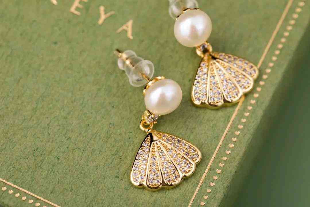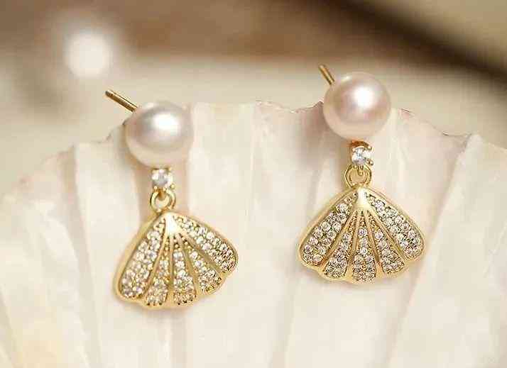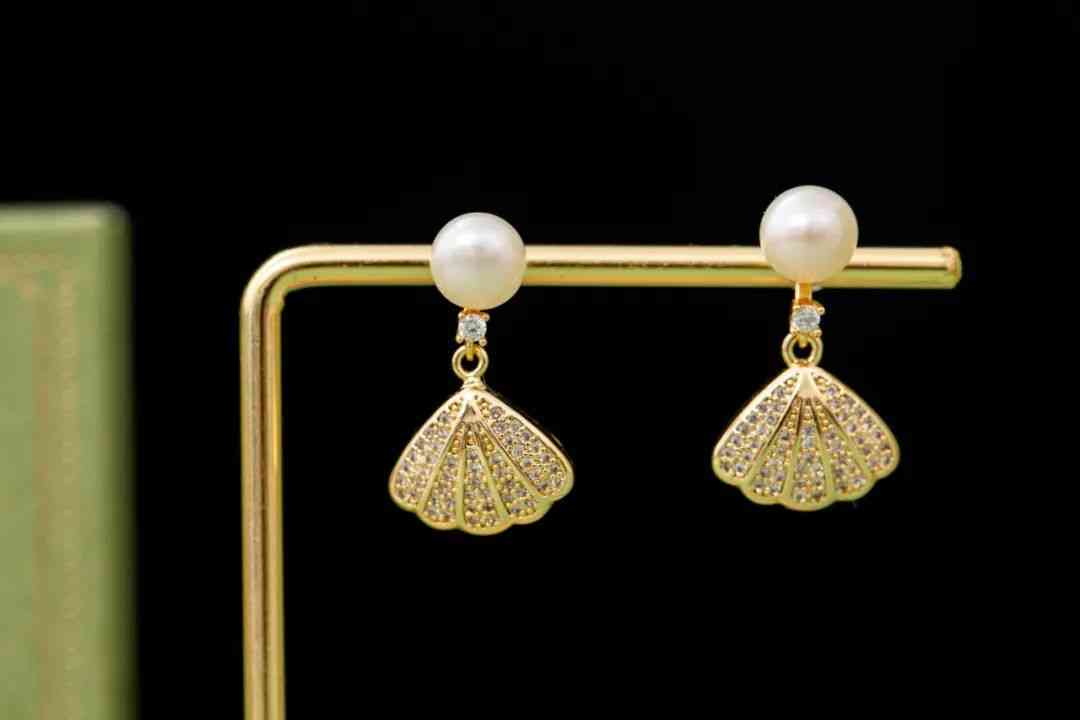 铜镀18k金+锆石,配上三年以上的高品质淡水珍珠贝壳款。珍珠像个小灯泡一样亮。