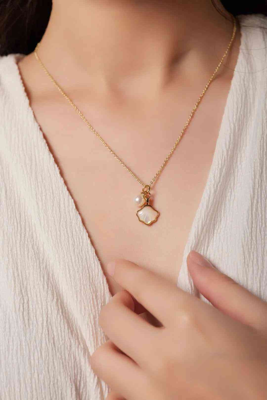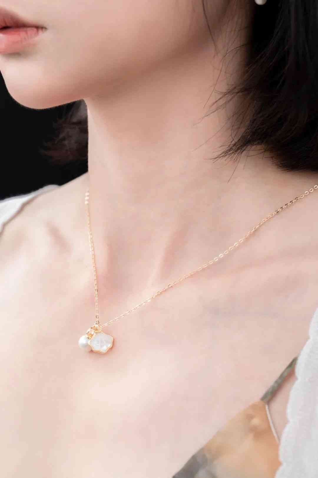 整体显干净,贝母的光泽和珍珠相互辉映,点缀在颈间,简约素雅,让人视线难以离开。