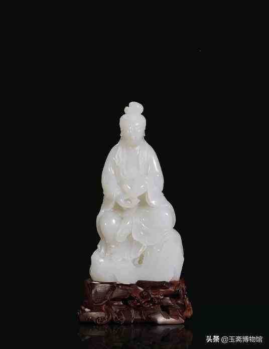 玉观音以整块和田羊脂白玉雕琢而成,观音低首垂目,面相饱满俊美,是典型清中期观音仕女开脸;神情端庄慈祥,似在俯览尘世众生。其发髻高束,发丝细密,左手持卷,与右手交叠置于腰间,游戏坐于洞石之上,呈现出女性特有的柔美婀娜,仪态万方。作品依托玉材,精工细琢,生动刻画出观音菩萨普度众生的慈悲之心与庄严祥和之相。