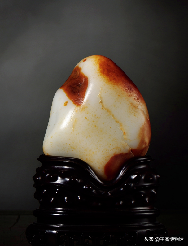 这件作品所选用的材质是新疆和田玉籽料,枣红色玉皮色泽鲜艳,玉质结构致密,细腻均匀,无绺无裂,洁净无瑕,白度亦佳,油润度尤好,呈现出如凝炼的油脂般的光泽与润度,从其白度、结构、油性等方面来看,此件玉作的材质在品质上达到了鲜有的羊脂级别,可以称之为“羊脂玉”。