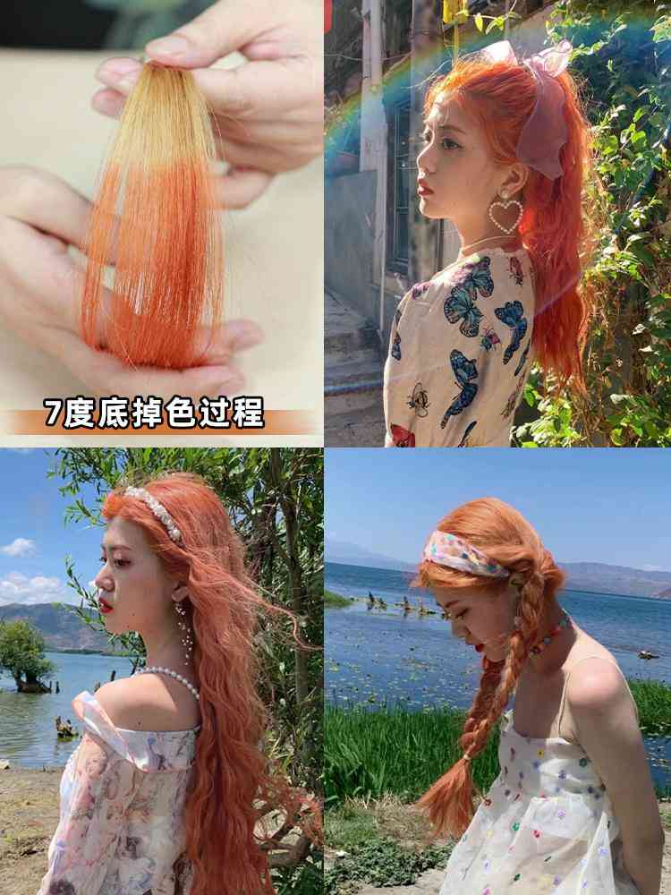 7度底染出来比5度底亮一点点,染出来就是一个很标准的脏橘色啦~超级适合夏天,非常显白,黄白皮都可入~但是稍微不适合黑皮,黑皮染了就跟顶着个黄色的电灯泡更黑了点!