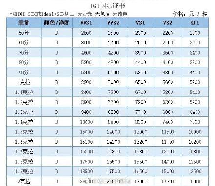 记者咨询一河南培育钻石订制商家,他介绍,目前他所售钻石颜色主要是D色,净度有VVS、VS、SI等规格,切工为3EX或Ideal+2EX。据他提供的报价表,一颗1克拉VVS1级的裸钻只需8200元,且持有IGI国际证书,算上戒托费用和订制工费, 一只一克拉的钻戒价格在15000元上下。 而记者了解到,周大福等珠宝品牌 相同规格的钻戒售价都在5万元以上。