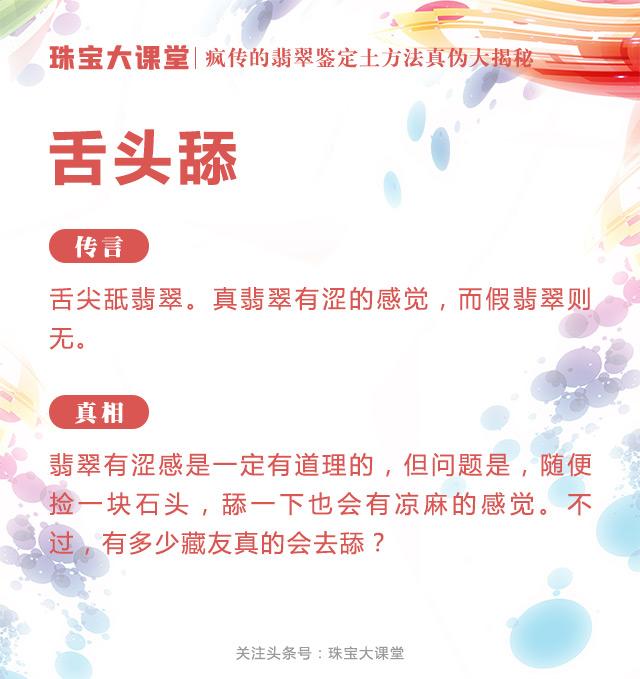 传言:舌尖舐翡翠。真翡翠有涩的感觉,而假翡翠则无。