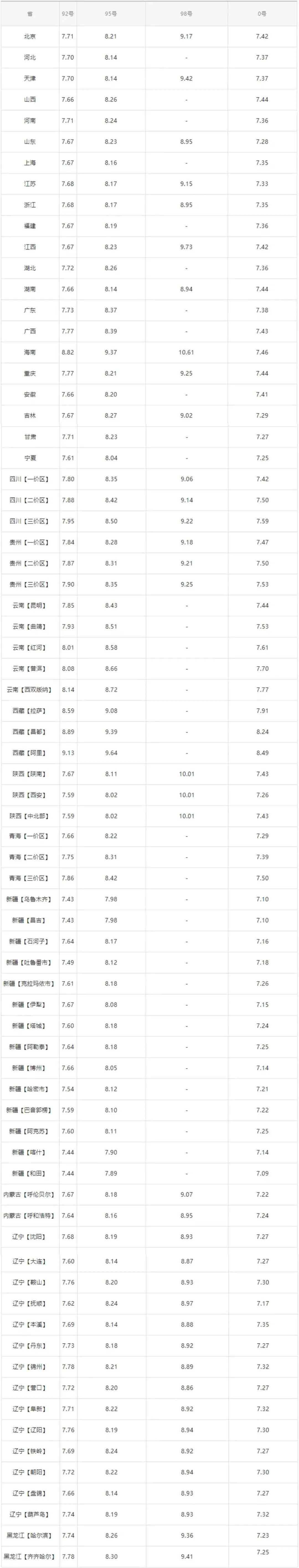 油价预测员小贝已经更新好全国各地下跌后的油价,请及时关注本号进行查询您所在省市的油价。
