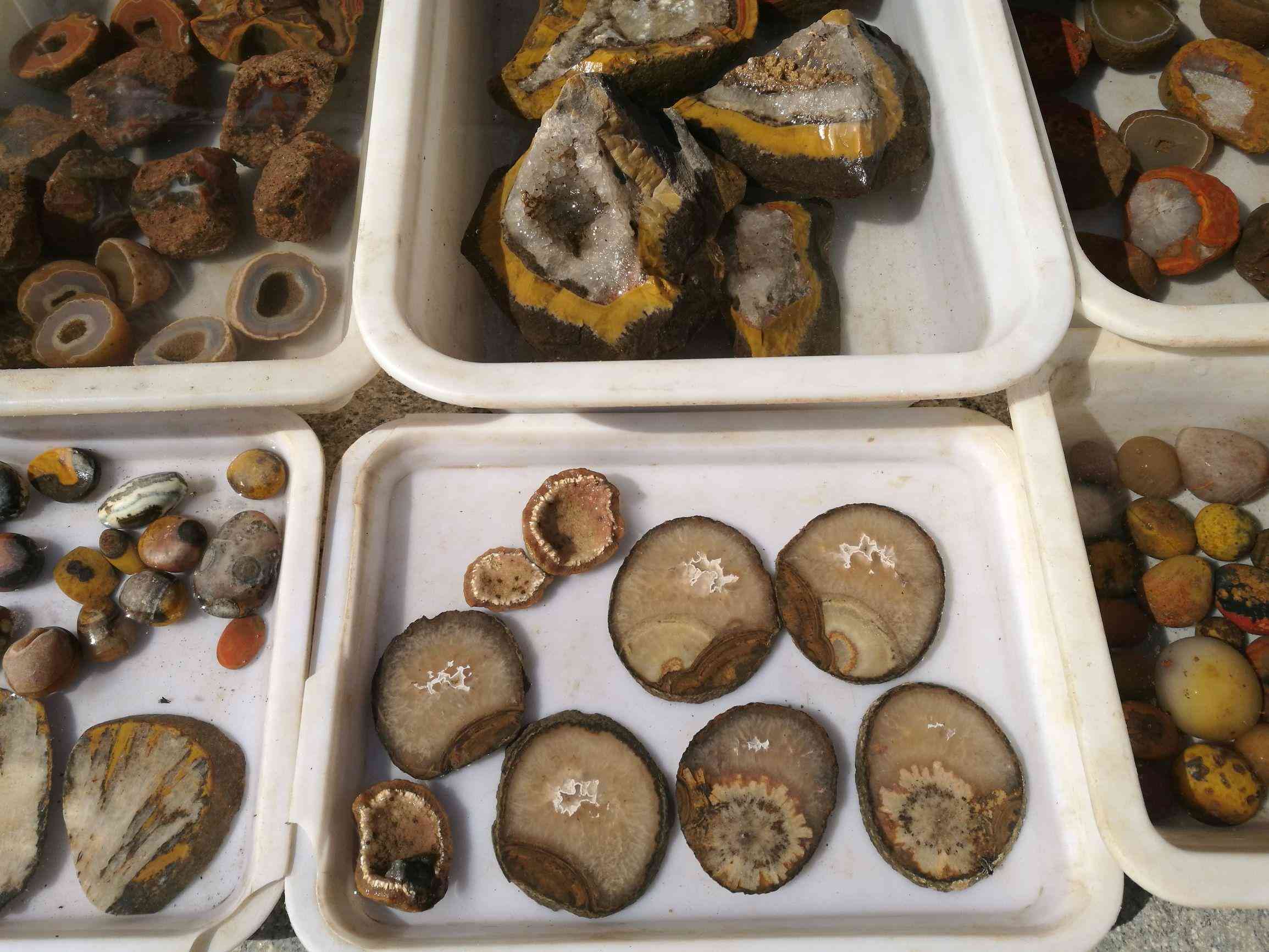 大市场外面就是这些卖原材料的,这是产业的上游环节。每一个十家子的玛瑙经营者都是一个创意大师,他们会根据开出来的图案设计一个故事,来设计基础图案下的形状。如果没有好的图案,就切片后做成手镯、麻将、手串。