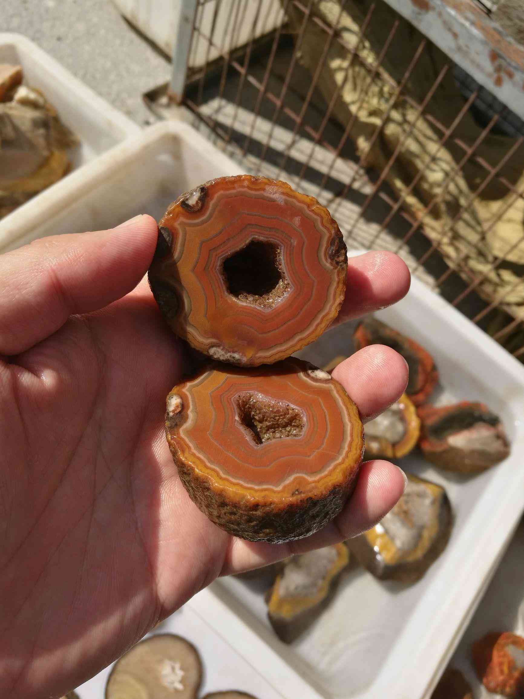这些都是天然的玛瑙石材,切开以后就是下面这个图的样子,中间的镂空是天然的,很神奇。这样的颜色都是天然形成,在现在叫做战国红。这块石头是河北宣化的,一对能卖到150块。