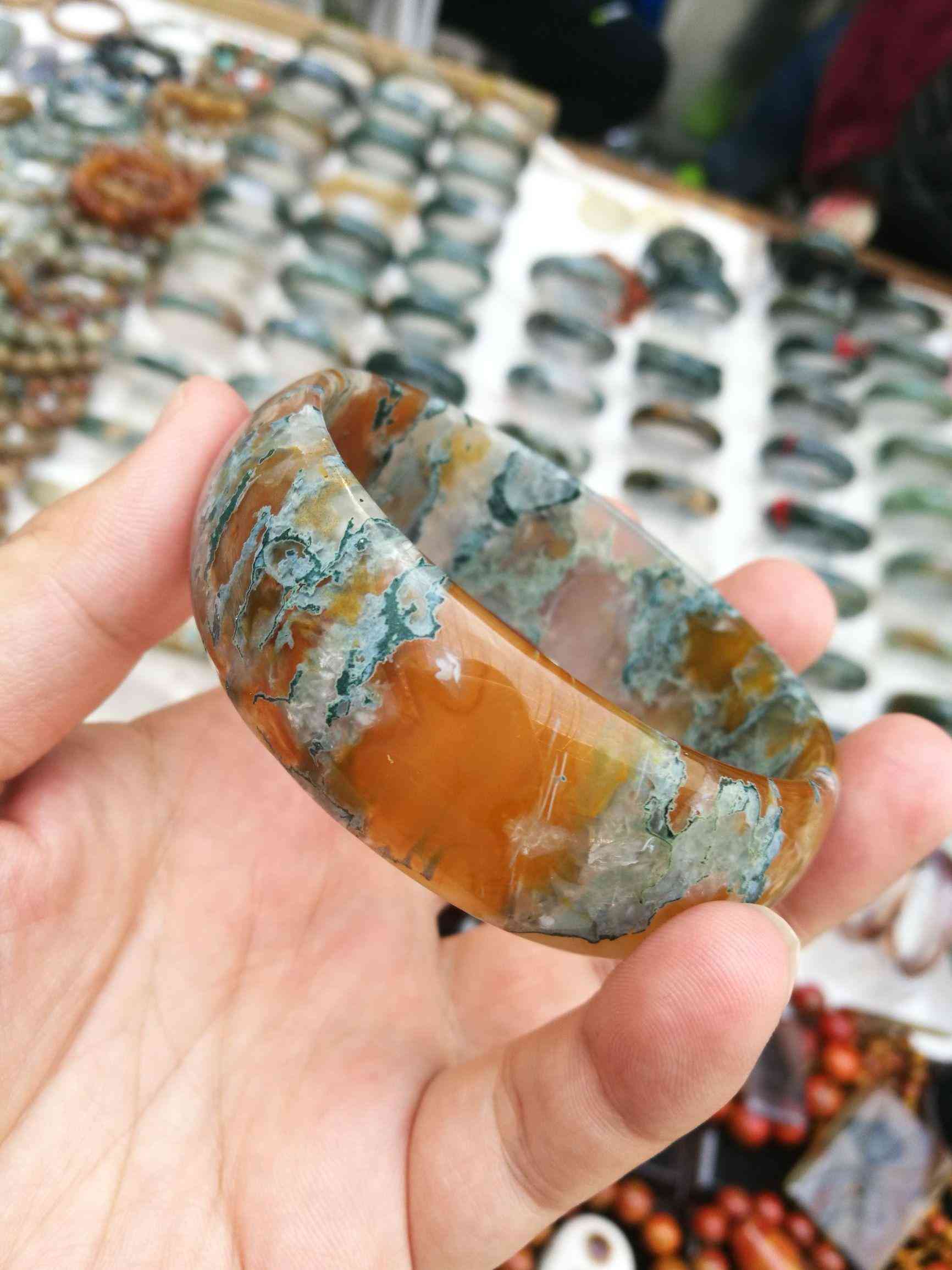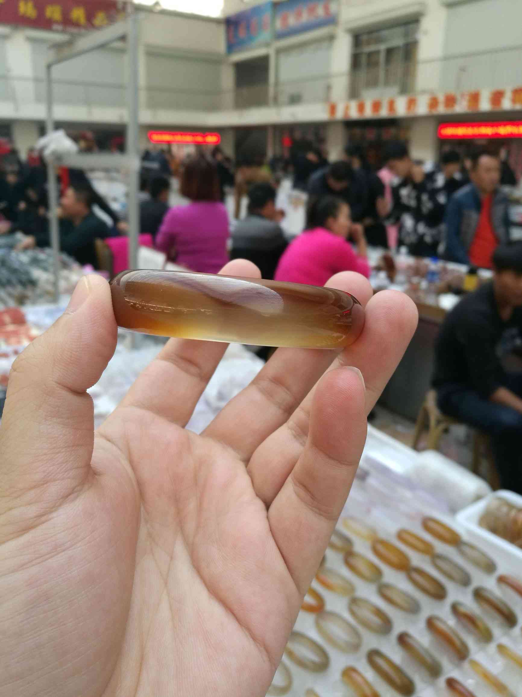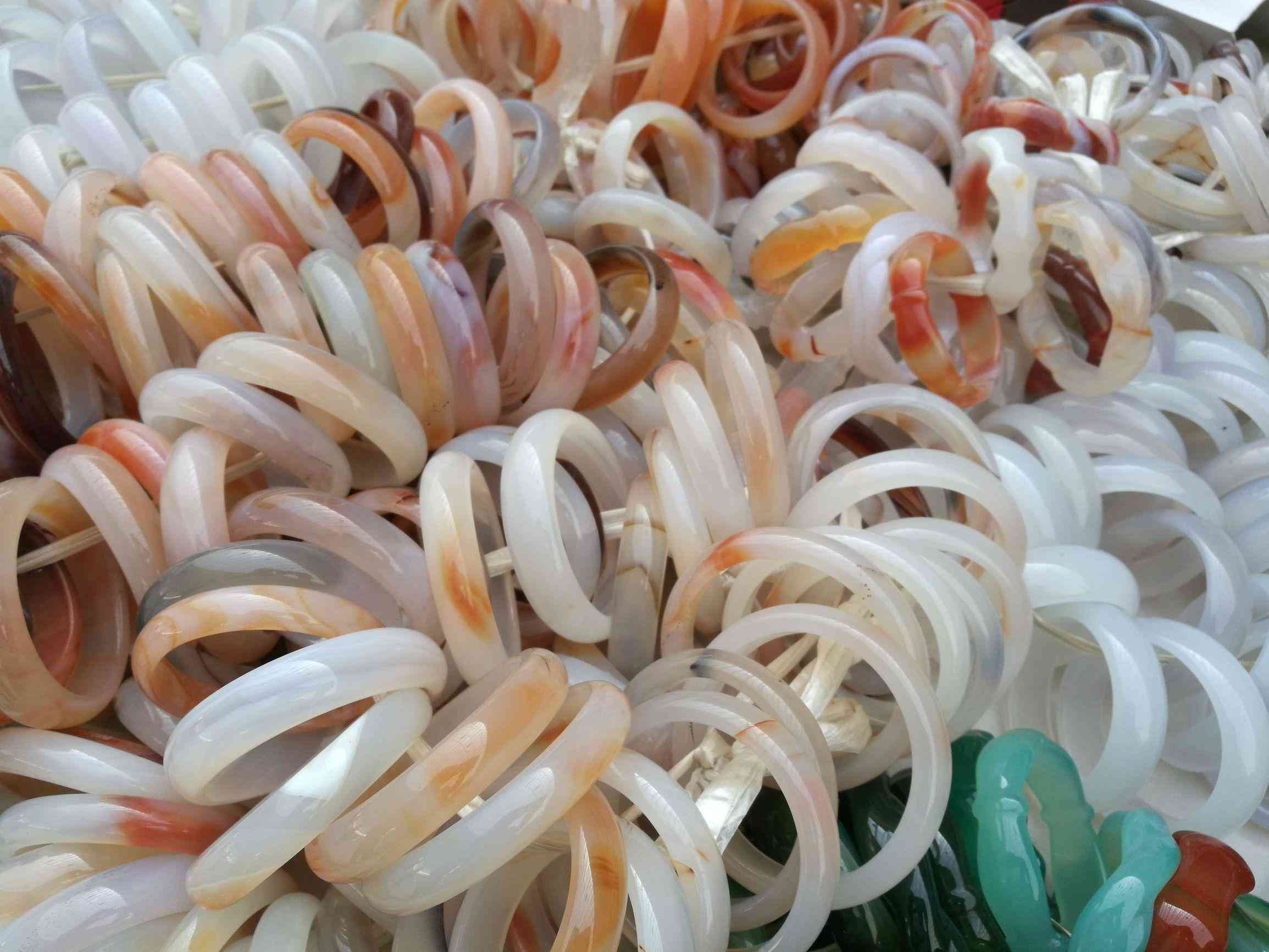 这样的是天然玛瑙石制作的手镯,颜色通透,在十家子批发的价格在50元左右。