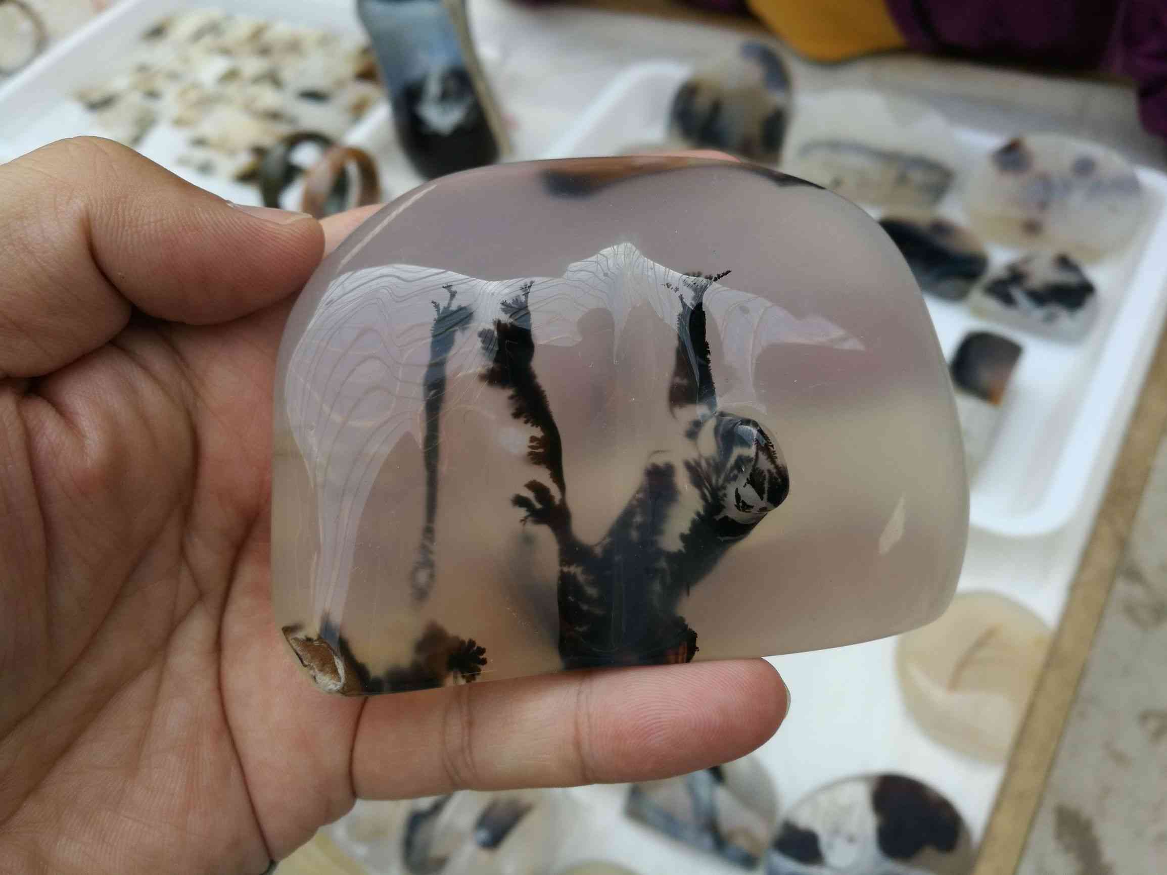 玛瑙石需要经历一亿到两亿年才能形成,是在火山晚期由热液填充了洞隙,填充的时候同时将各种微量金属、动植物注入了进去,形成了色彩极为丰富、天然图案最多的石英矿物。