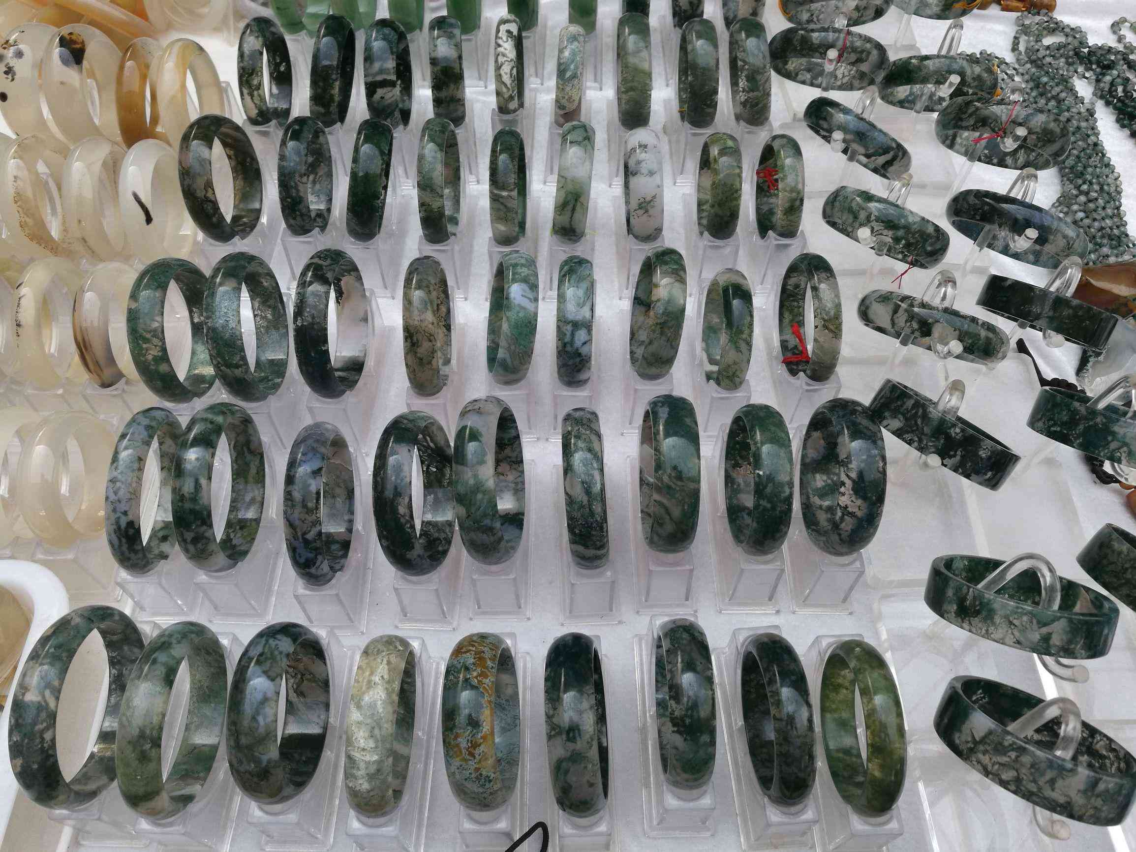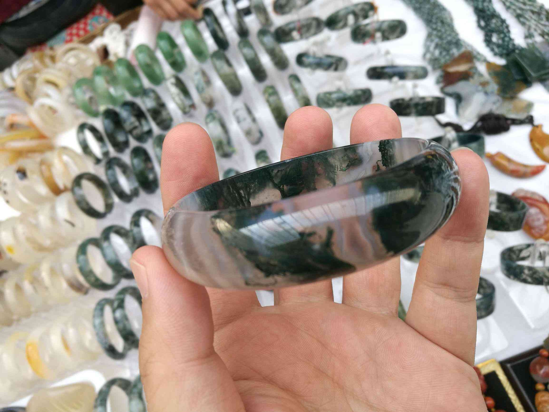 这样的石材来自印度,阜新本地也有。这样的手镯大概100-200 一个,水草手镯。