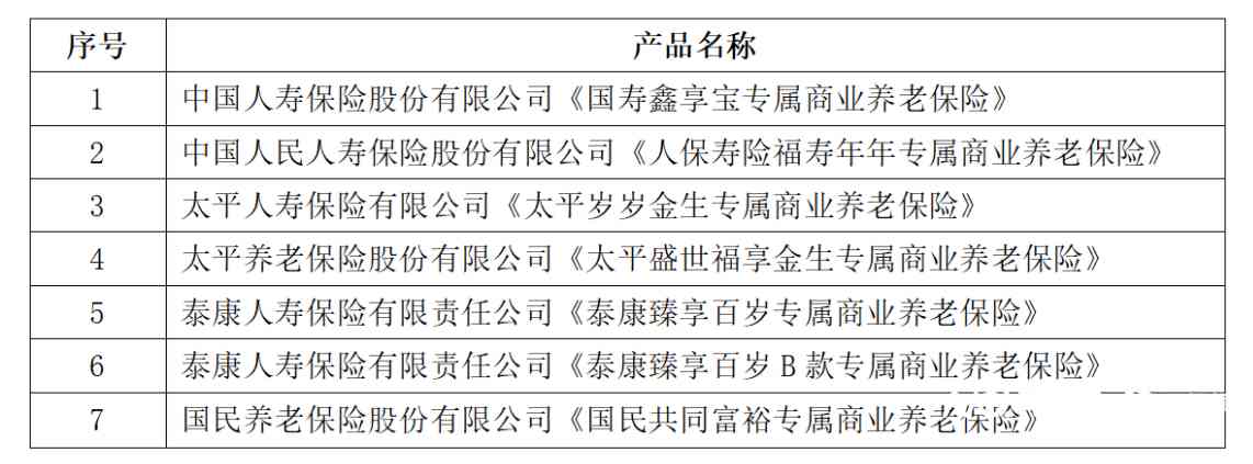 其中主要包括:国寿鑫享宝,人保寿险福寿年年、太平人寿岁岁金生、太平盛世福享金生、泰康臻享百岁、泰康臻享百岁B款和国民共同富裕7款专属商业养老保险,分别来自于4家人身险公司和2家养老险公司。