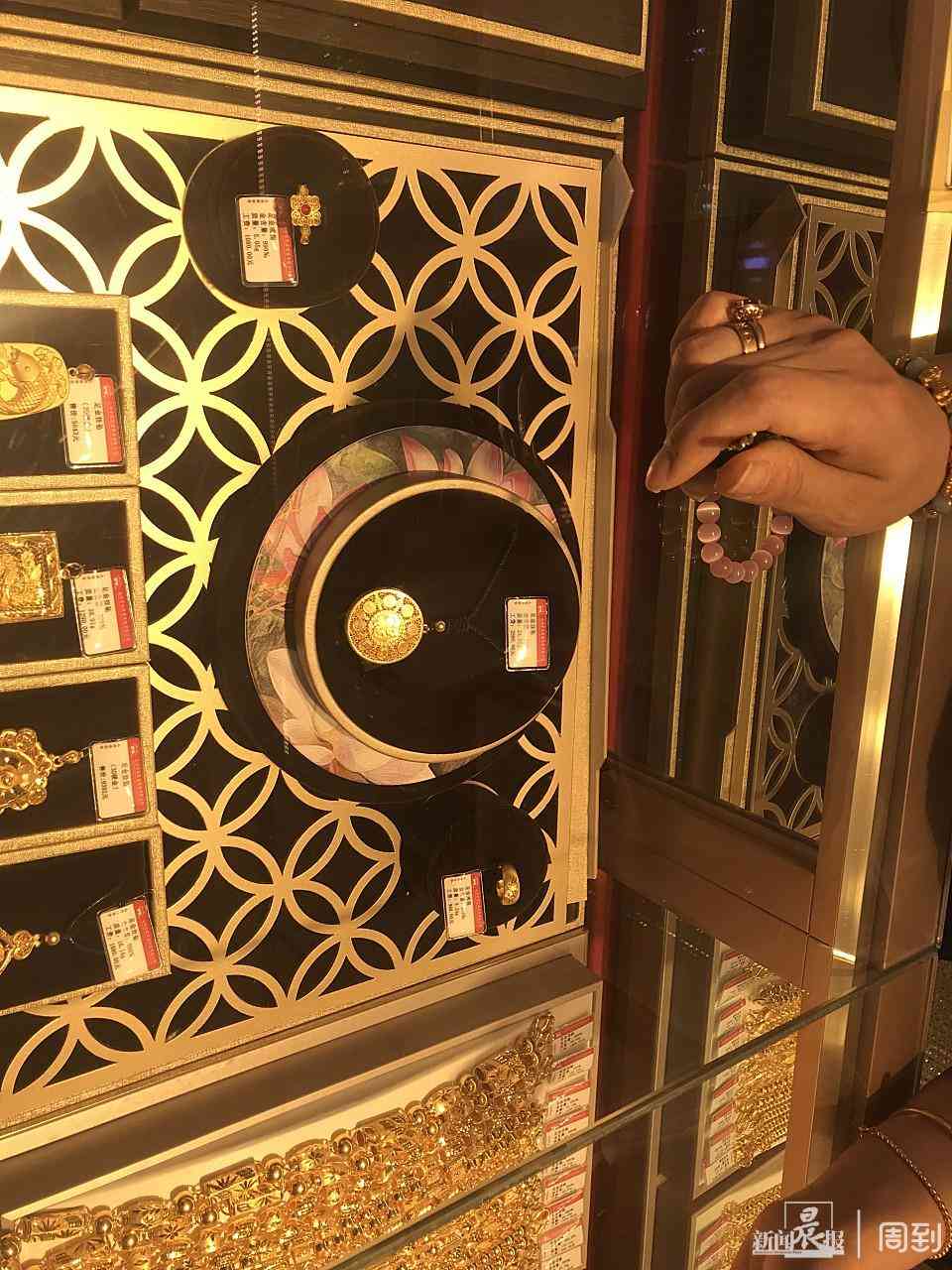 5月30日下午,张铭兰和大孙女站在金店柜台前,一位20岁出头、白白净净的小姑娘身着制服,为她们服务。