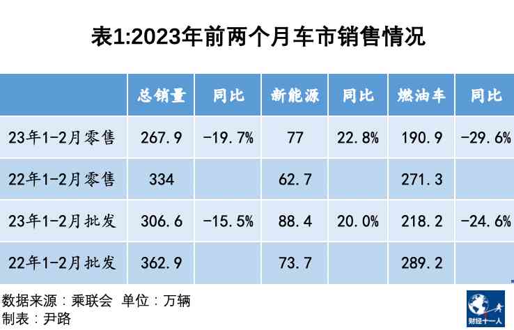 中国车市整体增速已很难维持高位,新能源车虽然还在保持增长,但也过了飞速发展阶段,增速回落,燃油车情况更加严峻。2022年全年燃油车零售减少超230万辆。2023年前两个月,车市表现更加艰难,中国乘用车零售销量下跌19.8%,批发销量下跌15.5%,新能源增速仅有20%左右,燃油车零售跌幅29.64%,批发下滑24.55%。车市萎靡不振是引发本轮价格战的根本原因。