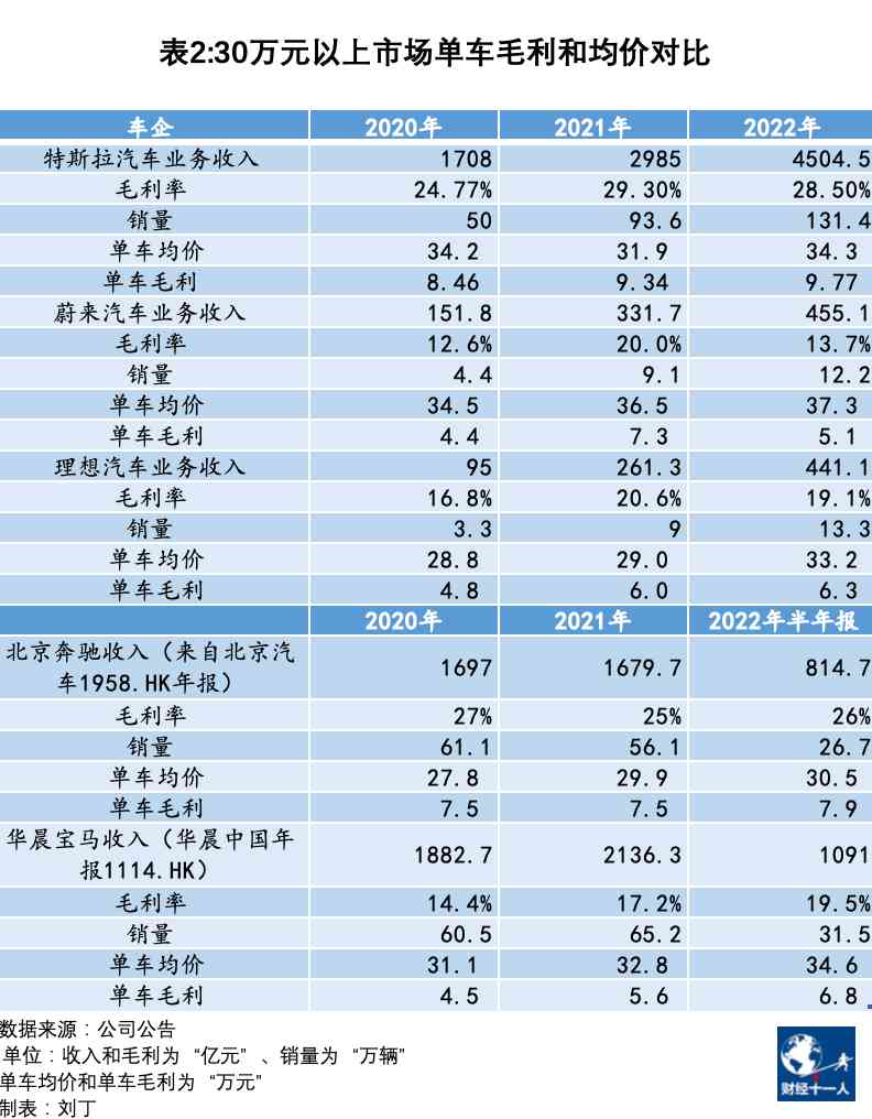 北京奔驰和华晨宝马平均车价为31万元和34万元,其成本控制的也较好,根据2022年半年报,毛利率为26%和20%,单车毛利分别为8万元和7万元,也有较大降价空间。蔚来和理想汽车的平均车价也较高,分别为37万元和33万元,单车毛利也可达到5.1万元和6.3万元。