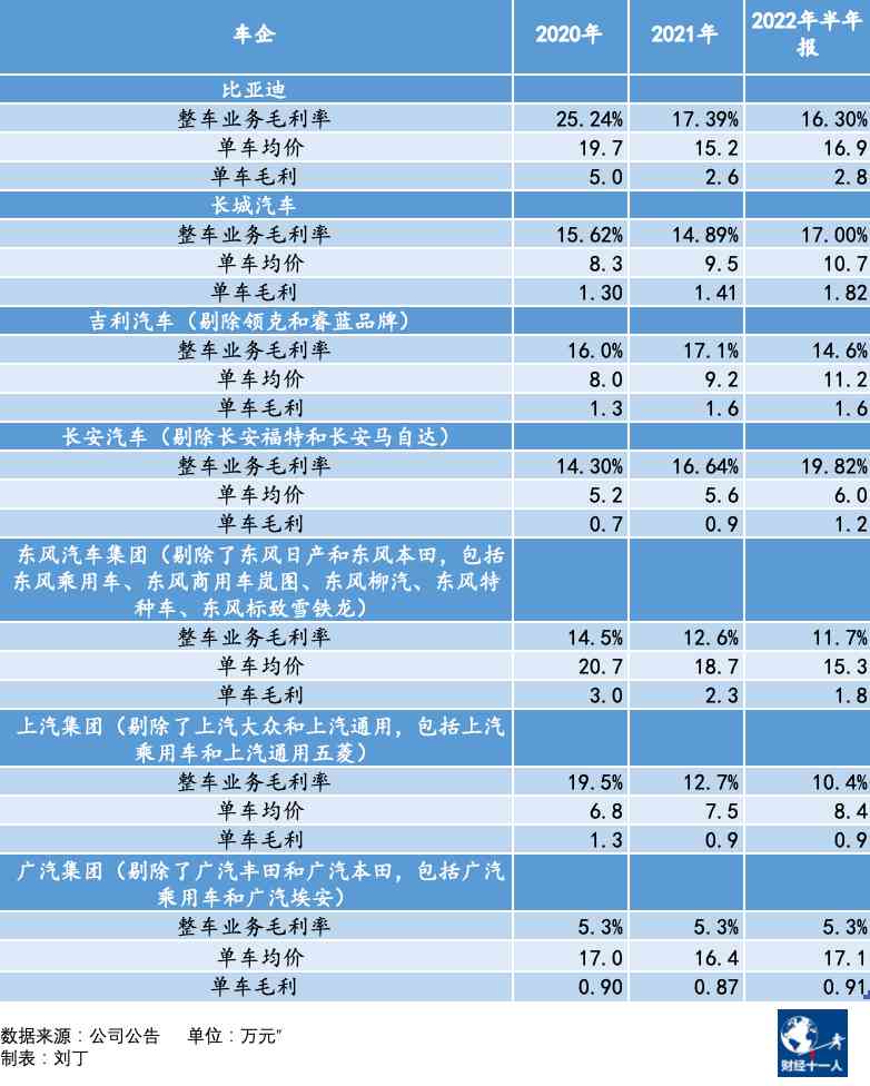 上汽集团覆盖的主要是上汽乘用车、上汽通用五菱,未包括上汽大众和上汽通用。因为上汽集团的收入计入了上汽大众和上汽通用,但是以销售公司方式套入,并未计入毛利,二者净利润以投资收益方式计入,所以,这里需要剔除二者的收入和销量,以免有偏差。另外,上汽集团2022年半年报未披露拆分数据,而上汽集团2021年整车业务收入占比约为73%,利润占比37%,以此推算其2022年半年报的汽车收入和毛利率。剔除了上汽集团汽车金融业务、零部件业务、贸易业务的收入;