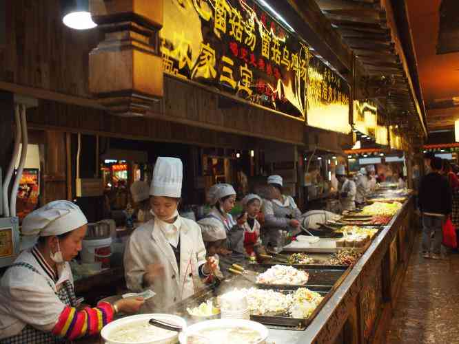 我们到达客栈大约9点多,古城依然灯火辉煌,老板娘建议可以出去走走。于是沿着七一街上行,走到小四方街,以为这里就是四方街了,其实不是。路过边上有规模的小吃店,忍不住买了丽江特色的小吃。事实证明,比上海城隍庙的小吃还要难吃很多。最极品的莫过于树皮炒树花,一开始还很惊喜,这是从来没有听闻过的食物,原来树皮树花也能吃,迫不及待买了半份10元。口就放弃了,真的就是吃树皮的感觉,又苦又涩还伴着很奇怪的一种辣味。小竹篓背着鸟蛋买15元,是一个咖啡杯大小的小竹篓,上面放着一个小荷包蛋,目测是鹌鹑蛋,下面号称是野山菌。尝了才知道,外观可爱味道狰狞,荷包蛋淡而无味很干巴,说是野山菌其实是野山椒还差不多,非常刺激的一种辣味饭,还咸的发苦。最好吃的莫过于过桥米线,当然这是相对而言的,20元一份,就是简单而清爽的米线。椰子汁10元一小杯,这个也比较正常。对丽江美食的向往,顷刻间化为苍凉。