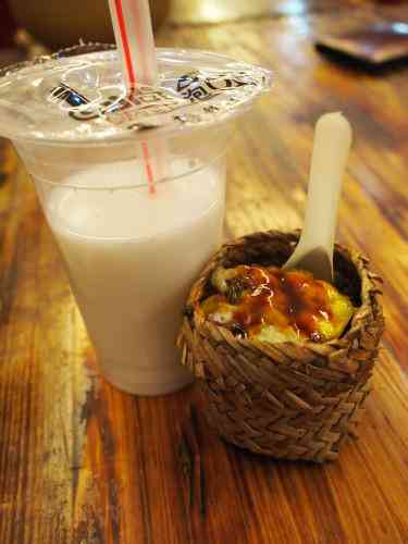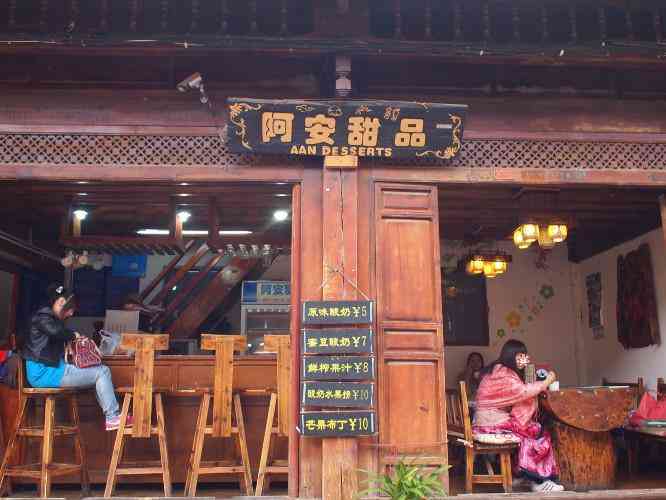 还有1个多小时才离开古城,我休息了一会儿似乎好点了,于是去附近逛逛,来到了“阿安甜品”,是个小破店。而环境优美位置佳的店,点评上却没有推荐,有名但朴素的地方肯定好吃,这是我总结的经验。最好吃的是榴莲布丁20,果肉很多,货真价实。红豆酸奶8,味道倒是一般了。现烤吐司5元一片,点了黄油+白糖,花生酱+炼乳,有点干巴,价格倒是不贵,一吃就饱了。