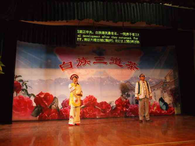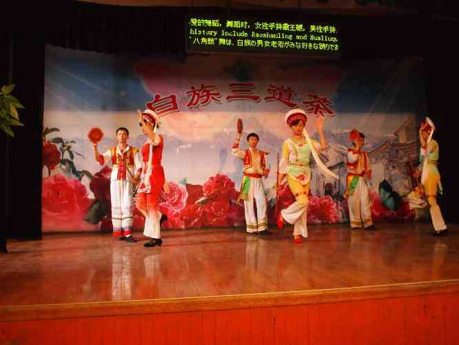 出发前在携程定了严家大院的门票48元,是原价的8折,于是直径走到景区。一开始还觉得有点贵,不就是个宅子吗,后来发现物有所值,因为门票不仅有景点的参观,还包含了一场演出,免费品尝白族三道茶。演出无非是白族的歌舞表演,硕大的场子空荡荡的,台下只坐了4位客人,演员们的表演却是尽心尽力,丝毫不打折扣。三道茶中,道茶是苦的,第二道茶加了红糖和乳扇叫做“甜茶”。第三道茶是回味茶,有蜂蜜和花椒,甜中带辣,有点像酥油茶。三道茶透出了白族人民的文化,果然很具特色。