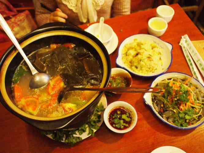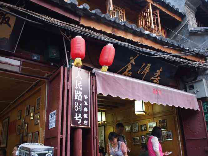 到了大理古城,终于可以美美吃上一顿了,苍洱春是这里最有名气的餐馆,价廉物美著称。苍洱春饭店位于人民路上段,属于步行街。果然好地方就是需要排队,拿了一个号会电话叫我们的,很人性化。先吃了乳扇垫垫饥,一个是老奶奶做的4元,一个是杨氏乳扇5元。老奶奶做的有点干巴,但是杨氏的上面涂的玫瑰花酱汁滴的满手都是,黏黏的。乳扇就是奶皮子涂上甜甜的酱汁,卷成一个圈,没有看起来那么好吃,但很有特色。回到苍洱春刚好排到我们,点了木瓜炒鸡30,炝螺肉30,砂锅弓鱼70,炒海菜18。木瓜炒鸡的木瓜是一种很小的青色的瓜,咬一口又酸又硬,不过和鸡块炒在一起蛮清爽的,就是放了好多花椒,像一个个小地雷,不小心吃到一个整个嘴巴全麻了。炝螺肉是酱伴螺肉,上面覆盖了许多花生碎和新鲜蔬菜,微辣刚刚好确实做的很棒。炒海菜也叫水性杨花,有点滑滑的细长的菜,像芹菜一样很少有叶子,还是挺好吃的。砂锅弓鱼就有点失望了,弓鱼是一种比较小的没有骨头的鱼,一条也就1~2斤的样子,把鱼放在砂锅里,味道很清淡。