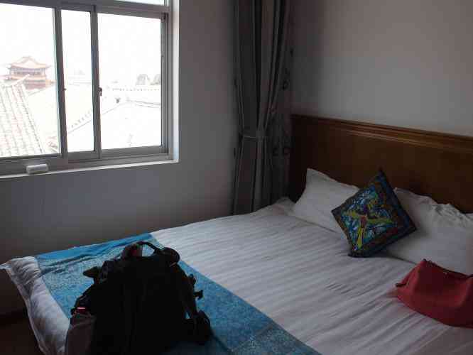 继续8路1.5元到古城东门,大约10公里,一度以为到了荒山野岭,原来市区离古城那么远。我们住在博爱门,也就是南门附近,可是没有到南门的车,一开始还有点担心,东门下来后发现多虑了。原来大理古城开通了公交电瓶车,到哪里都是3元,还可以观光游览。古城非常之大,目测有丽江古城的3~4倍,难怪叫大理州。到了博爱门,电话梦园大理客栈,老板马上出来接了,还帮我们提箱子,人非常非常的好。客栈原来就在博爱门边上一个小巷子里,1分钟就到。客栈没有先前夕露小榭的奢华,反而显得淳朴舒适,房间也是干干净净,还送2瓶免费的水,139能有这样的条件真的心满意足了,而且还是景观房哈,虽然远了点还是能勉强看到洱海。