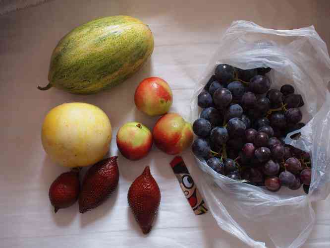 买了大理的水果带回客栈洗了吃,有一种毛刺刺的叫“甩过”,酸酸臭臭的味道很特别,10元4个。还有冒充蓝莓的葡萄,十几元一斤,后来才知道正宗的要90元,试吃的和买的差好多,油桃5元4个。为了让我们买一只当地的菜瓜,水果摊送一把刀片,没几小时就锈了啊~