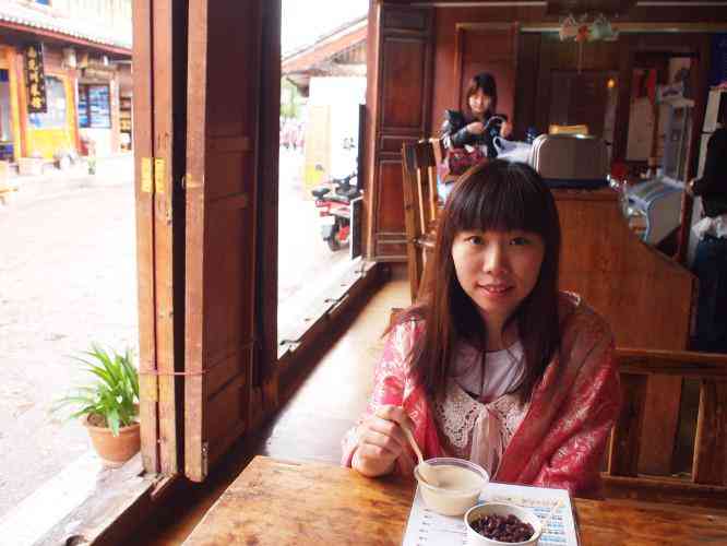 桥是束河的点睛之笔,桥上总有拍婚纱的人占着地方,一对接着一对有点霸道。桥边是点评推荐的“丁丁酸奶”,也大研也有连锁店,装修风格简单,没有啥特色。进店到了点单的地方,我问这里有洗手间吗?店员说,要在这里吃东西才可以用,一下把我雷到了,顿生对店主的鄙视之情。其实我的本意是,我想在这里吃东西,但是我也想去洗手间,要是这里没有,我得在外面去过洗手间,再回来吃东西,要不然等不及。对于这种小气的店,肯定好不到哪儿去。果然酸奶就很一般,很小一杯100~150ml顶多了,是最最普通的自制酸奶,很酸很酸的,里面芒果也不香。巧克力面包就是巧克力酥皮面包,由于是现烤的,还比较松软,酸奶+面包套餐价23元。