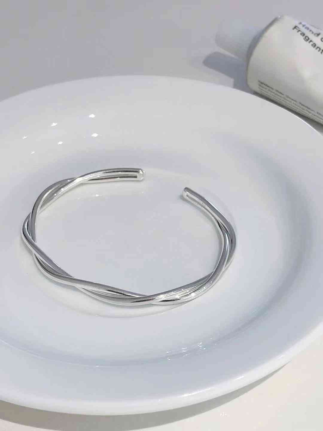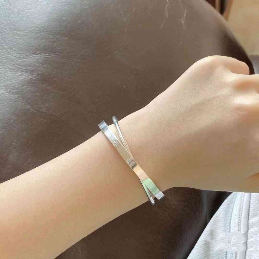 双层交织的手镯,虽然没有双环手镯那么个性。却也有着独特的精致之处,两层圆环交织的银手镯,又做了抛光的处理,亮度自然会更高一些。而且开口的设计,可以更自然地调节手镯的宽度,方便佩戴。