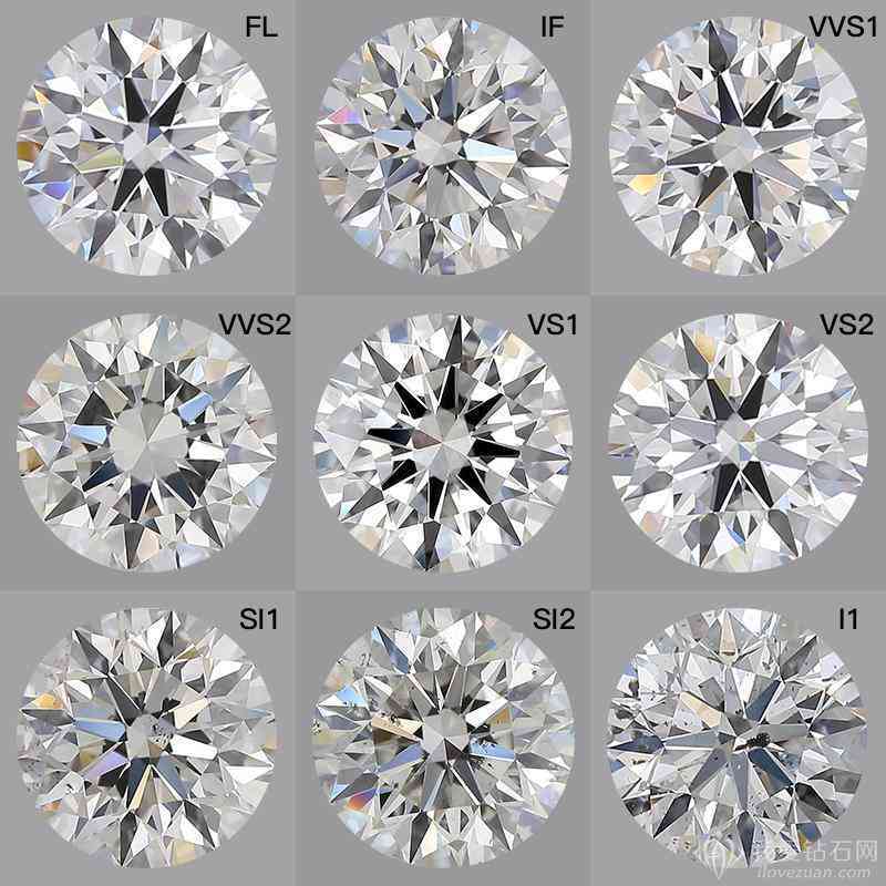 FL(无瑕级):钻石完美无瑕钻石,完全没有瑕疵,属于收藏级别。IF(内无瑕级):钻石内部无任何瑕疵,表面或许有一点点瑕疵,重新抛光即可除去。VVS1/VVS2(极轻微内含级):瑕疵非常少,在专业的仪器下只能看到一点点瑕疵。VS1/VS2(轻微内含级):钻石有非常微小的肉眼看不到的瑕疵,但可以在放大镜下看到一些杂质和瑕疵。SI1/SI2(微内含级):钻石有小瑕疵。其中SI1级钻石通常肉眼不可见瑕疵,而SI2级钻石瑕疵可能被肉眼观察到。I1/I2/I3(瑕疵级):钻石容易看到小瑕疵,个别有明显的解理和裂隙,一般不用在首饰上。