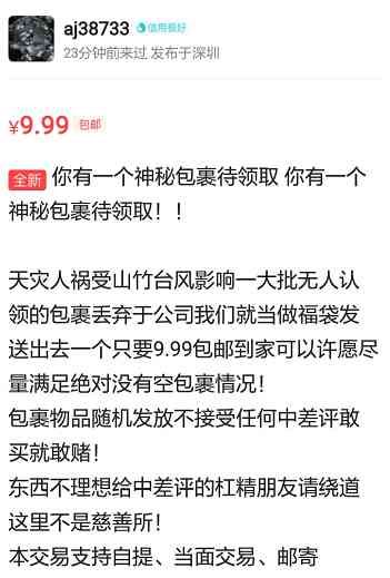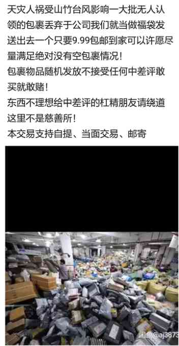 深圳某日用品生产企业的电商运营主管钟伟连(化名)在交流时表示,这几年台风季总会有一些电商卖家在网上兜售所谓的低价泡水、受损快件。然而类似今年“山竹”之后,如此大规模在众多二手平台出现的“福袋”,却比较少见。