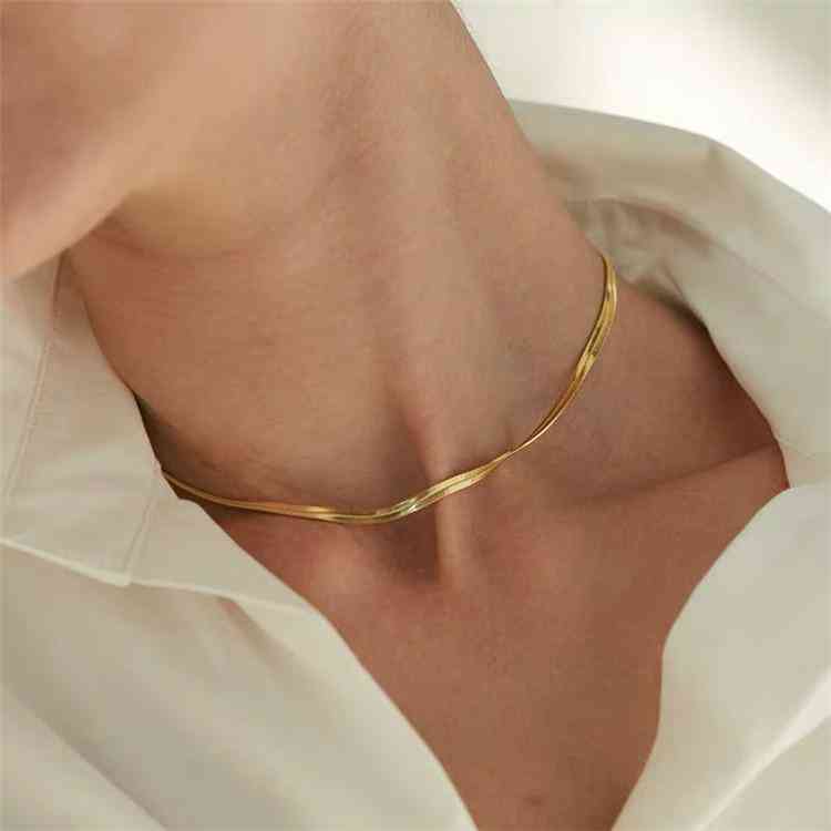 蛇骨链都比较软,贴着肌肤很有流动感长度一般到锁骨的位置,形状看起来就像蛇骨一样柔韧多变,可以单独佩戴,也可以跟其他项链叠戴,简约高级,属于比较性感优雅的首饰。