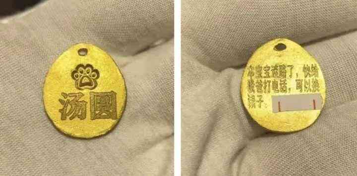 有男青年用家里闲置的金锁给自己心爱的小狗制作了一个吊坠,圆形的金吊坠正面刻有小狗名字“汤圆”和一只狗爪,背后刻有主人的电话,防止小狗走失。
