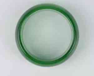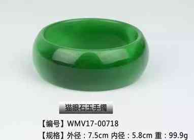 猫眼石玉手镯,外径7.5厘米,内径5.8厘米,重99.9克,为民国晚期的珍品。其质地极优,冰润细腻,水润饱满,碧绿盎然,翠色欲流,颜色十分诱人,是上乘的收藏品。此藏品在自然光源下,总会散发着柔和而浓艳的光芒,那种美丽难以名状,灵动而内含韵味,令人怦然心动。“猫眼石玉手镯”之所以受人喜爱,除其形状圆润,色泽亮丽,精巧细致之外,它还不分身份、地位、年龄均可佩戴。佩戴起来非常高端,冰凉舒服,给人一种精美雅致,温润含蓄的感觉,无形中衬托出佩戴者高贵的气质。同时,猫眼石常被认为是好运气的象征,人们相信它会保护主人健康长寿,免于贫困。因此,此猫眼石玉手镯可以说是可遇不可求的珍宝,实为典藏佳品。